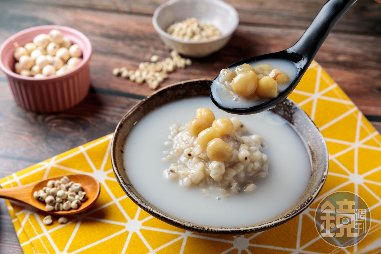 中醫認為,白色食材如杏仁、銀耳潤肺、薏仁利濕,煮成甜品,讓人養生不委屈。李記甜品的「養生蓮子薏仁湯」只用大薏仁熬煮,完全不加澱粉,清香滑順、純天然,配料鬆軟大薏仁搭配大麥,層次往上跳一階。