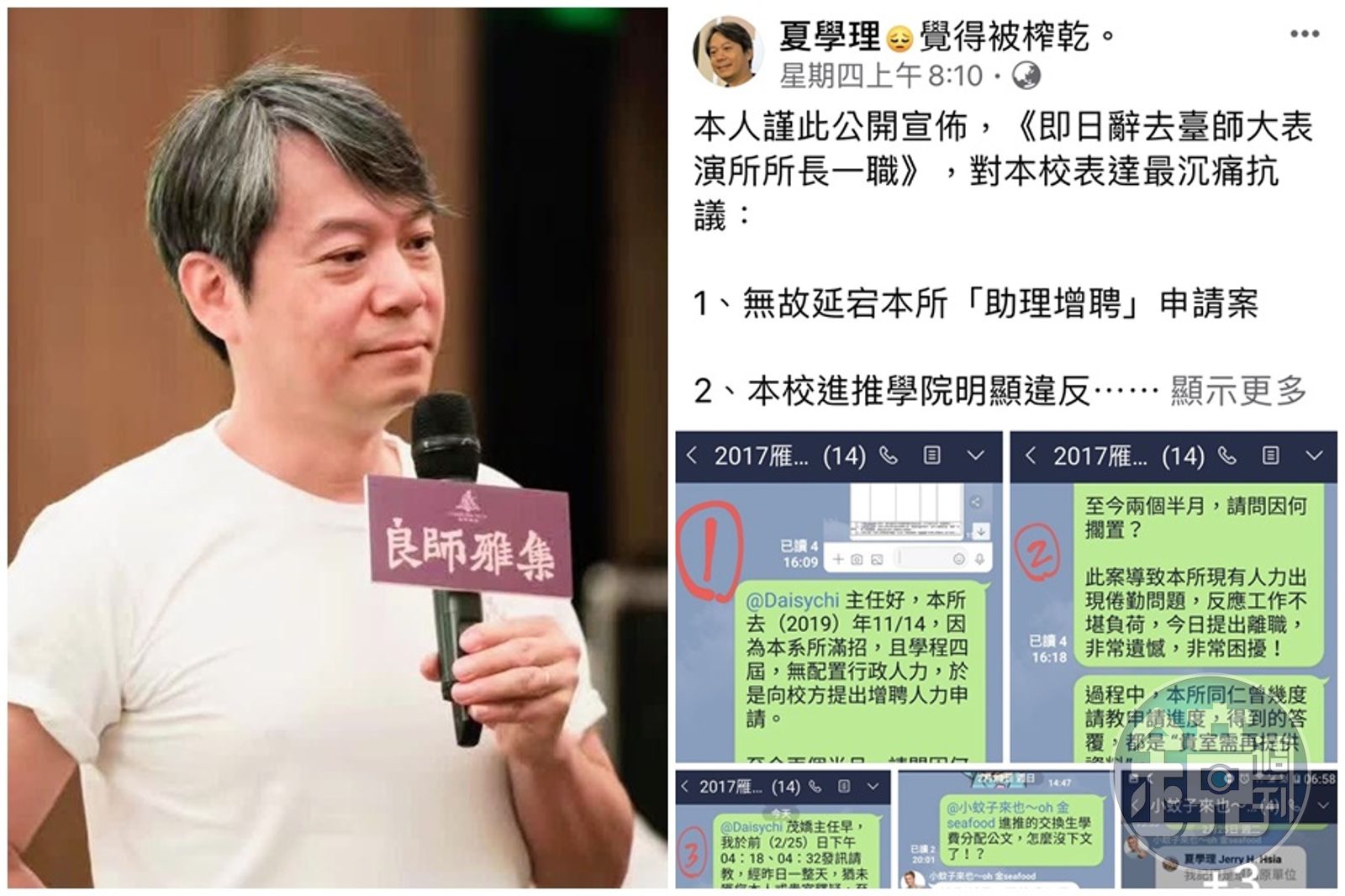 更離譜的是,夏學理表示,2個月來,本年度經費未見校方撥付,均由他代墊支出款項。夏學理昨(28日)晚再度發文強調,他在臉書上寫的,一切有憑有據,這是知識份子的根本,更是最起碼的道德良心。再度砲轟臺師大校方「順他者,昌!逆他者,斷糧!」「只看是不是『自己人』」,甚至「讓『基層扛責』」。
