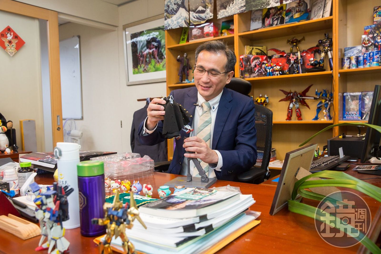 鄭運鵬的辦公室裡不只有鋼彈,「無敵鐵金剛」「蓋特機器人」也有珍藏;另外像是美漫電影與《魔鬼終結者》的大型人偶,《星艦迷航記》的模型擺設,甚至是超商的HelloKitty玩具,都可以在辦公室的某一角發現。