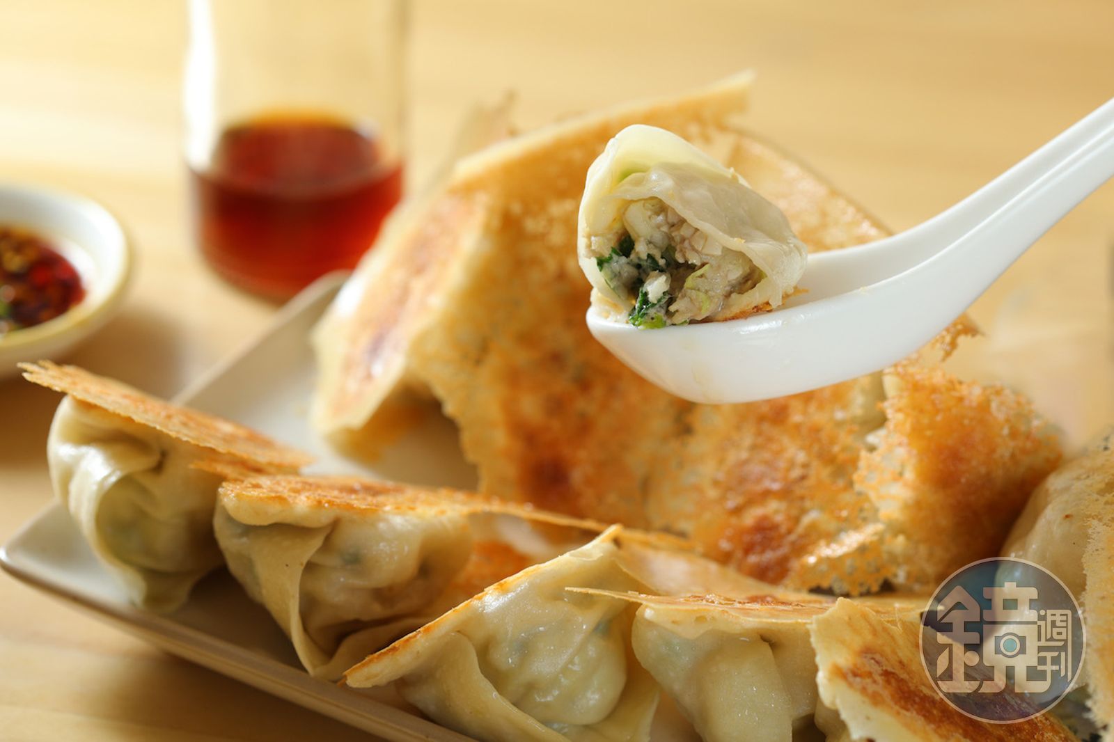 創業老闆余天瑞說:「每日現擀的鍋貼皮厚度0.5公分,包入肥瘦比3比7的豬後腿絞肉和韭菜、高麗菜。」這餡料不簡單,我邊吃邊追問一定還加了祕密武器,「肉餡還塞填了用豬骨熬煮的高湯凍。」用包小籠包的技法和高成本做成的胖鍋貼,一顆入魂啊~