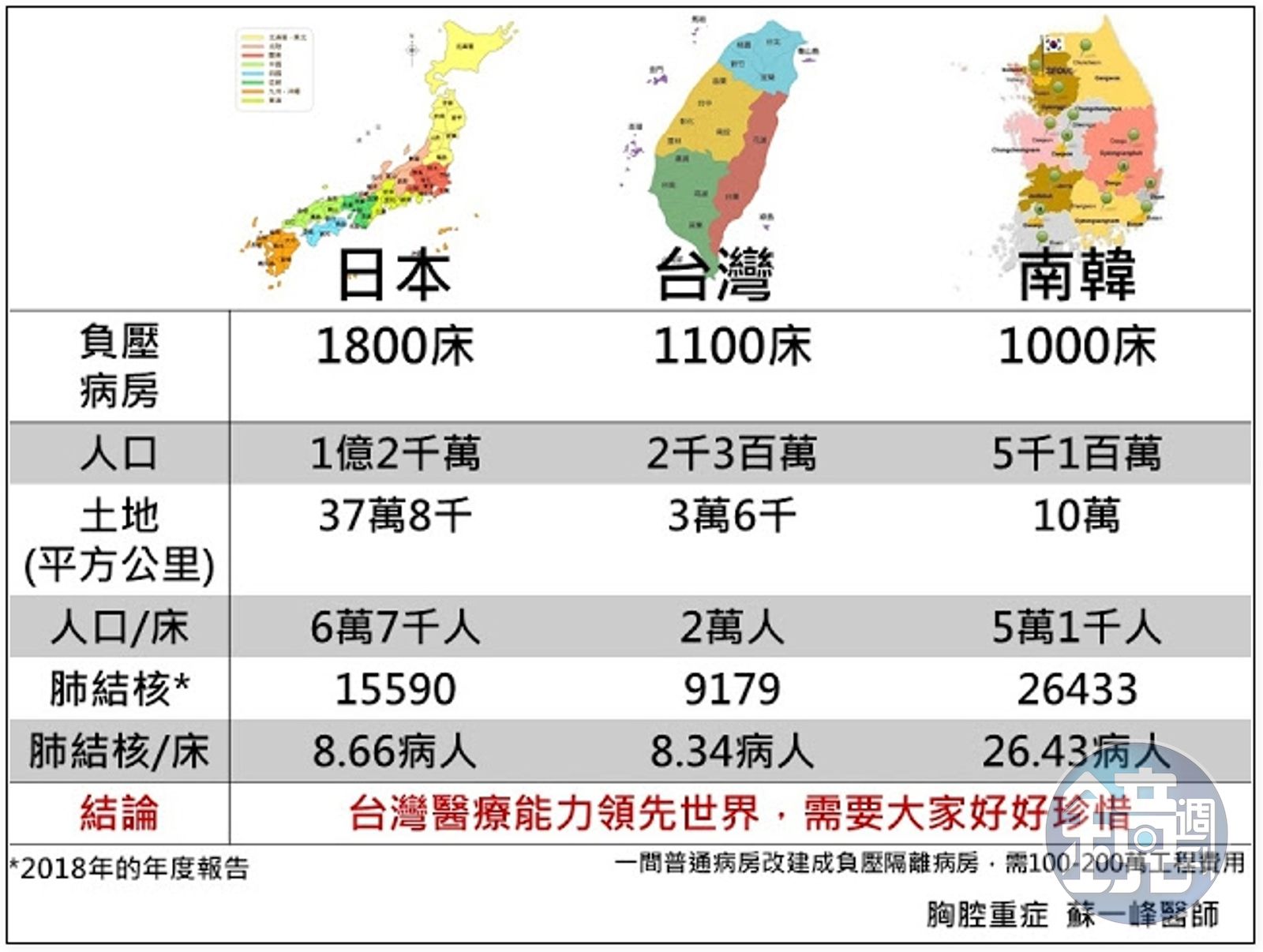 蘇一峰醫師昨(2日)在臉書po文指出,「南韓的土地是台灣的3倍、人口2倍多,為何只有與台灣相當多的負壓隔離病房,只有1,000床呢?」他表示建置負壓隔離病房所需耗費的成本高昂,自己曾經工作的醫院,把一間加護病房病床,改建成負壓加護病房,當時施工的經費預估是250萬元。