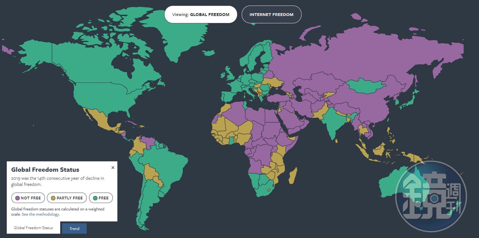 香港則因為去年爆發的反送中事件,港府的作為嚴重侵害到人民權利,今年的評比分數較去年下降4分,只拿到55分,被列為「部分自由」。