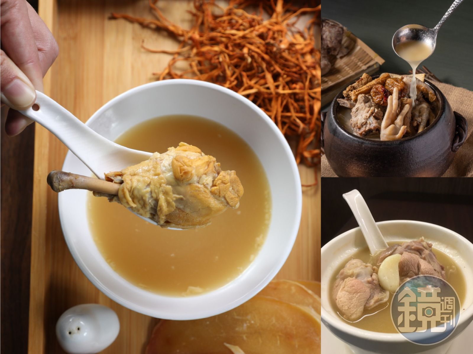 為了滿足台灣人喜歡吃料的習慣,她特地用50支雞腿來熬「蟲草花響螺雞湯」,「在香港不會這樣做,一定都是用整隻雞去煮,而蟲草花能潤肺、提高免疫力,響螺可增加甜味。」由於邊煮邊撇油,讓湯喝起來甘甜不膩,雞腿肉也像被化骨綿掌震過,筷子一夾就骨肉分離,口感鮮嫩,依舊有甜味。