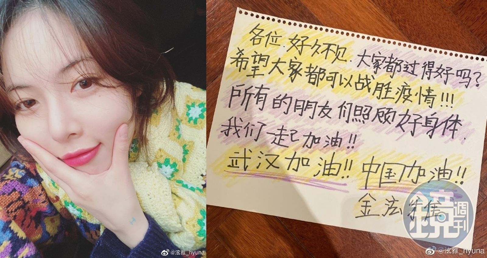 接著泫雅也在微博PO出另一份中文版本的手寫信,以簡體中文寫下:「各位,好久不見,大家都過得好嗎?希望大家都可以戰勝疫情!!!所有的朋友們照顧好身體,我們一起加油!!武漢加油!!中國加油!!」上傳5小時已獲得6萬多名網友按讚。