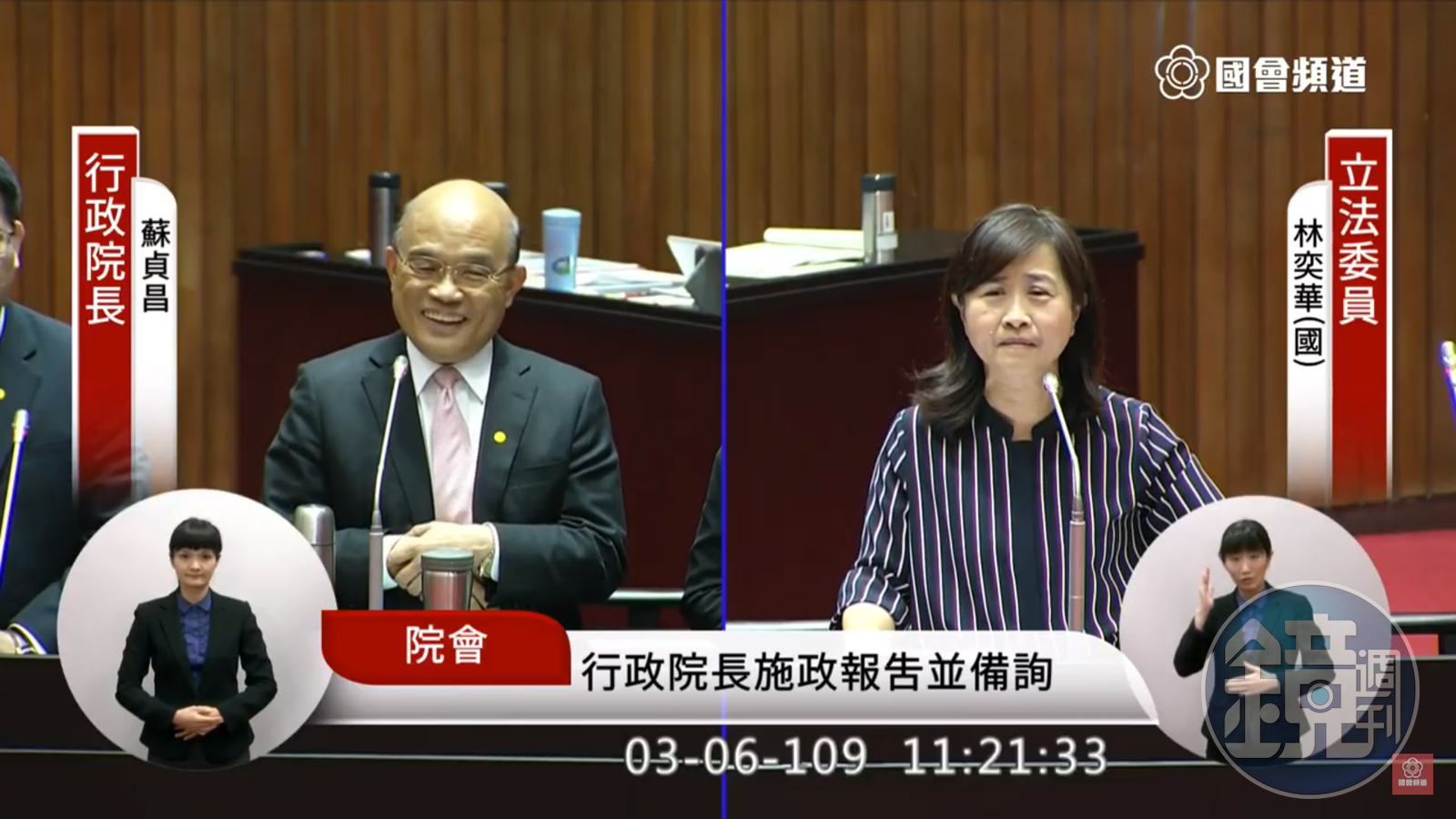 蘇貞昌看不下去,欲插話說:「委員啊!等一下!」林奕華原本要質詢下一個議題,聽到蘇貞昌插話,怒回:「不要浪費我的時間,院長,抱歉我的時間!請閉嘴啦!」讓蘇回說:「唉啊!可惜委員!」林則接著說:「我的時間賣安內(不要這樣)好嗎?」蘇仍接著說:「可惜啦!」林則再嗆:「我的時間,你不可以這樣!」