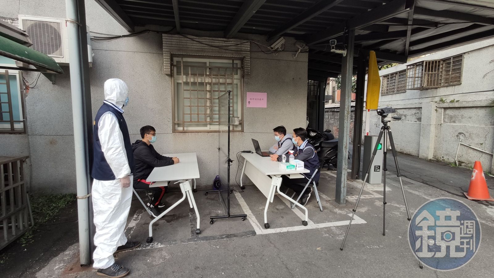 永和分局今日啟用的戶外偵詢室是位在分局旁空曠通風的機車棚,現場架設桌椅、電腦及錄影音器材及照明設備,偵詢員警與犯嫌或報案人有一定距離,中央還隔著壓克力板,阻隔偵詢中的飛沫傳染,走道外也會有員警進行戒護。每日保持一組人員待命。