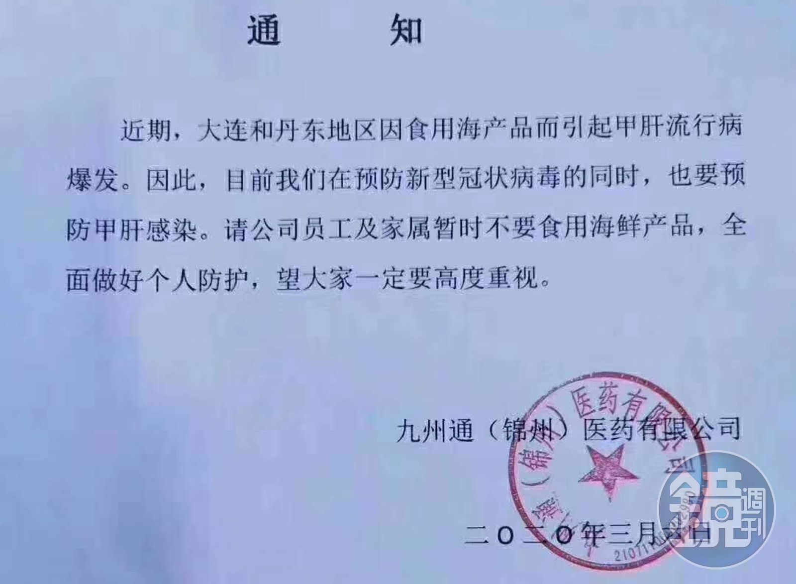 中國除了武漢肺炎疫情持續肆虐外,東北疑似出現多起「A型肝炎」,一張「九州通(錦州)醫藥有限公司」公告於本月6日發出,提醒員工「在預防新型冠狀病毒同時,也要預防甲肝感染(A型肝炎)。」該公告在網路上瘋傳。