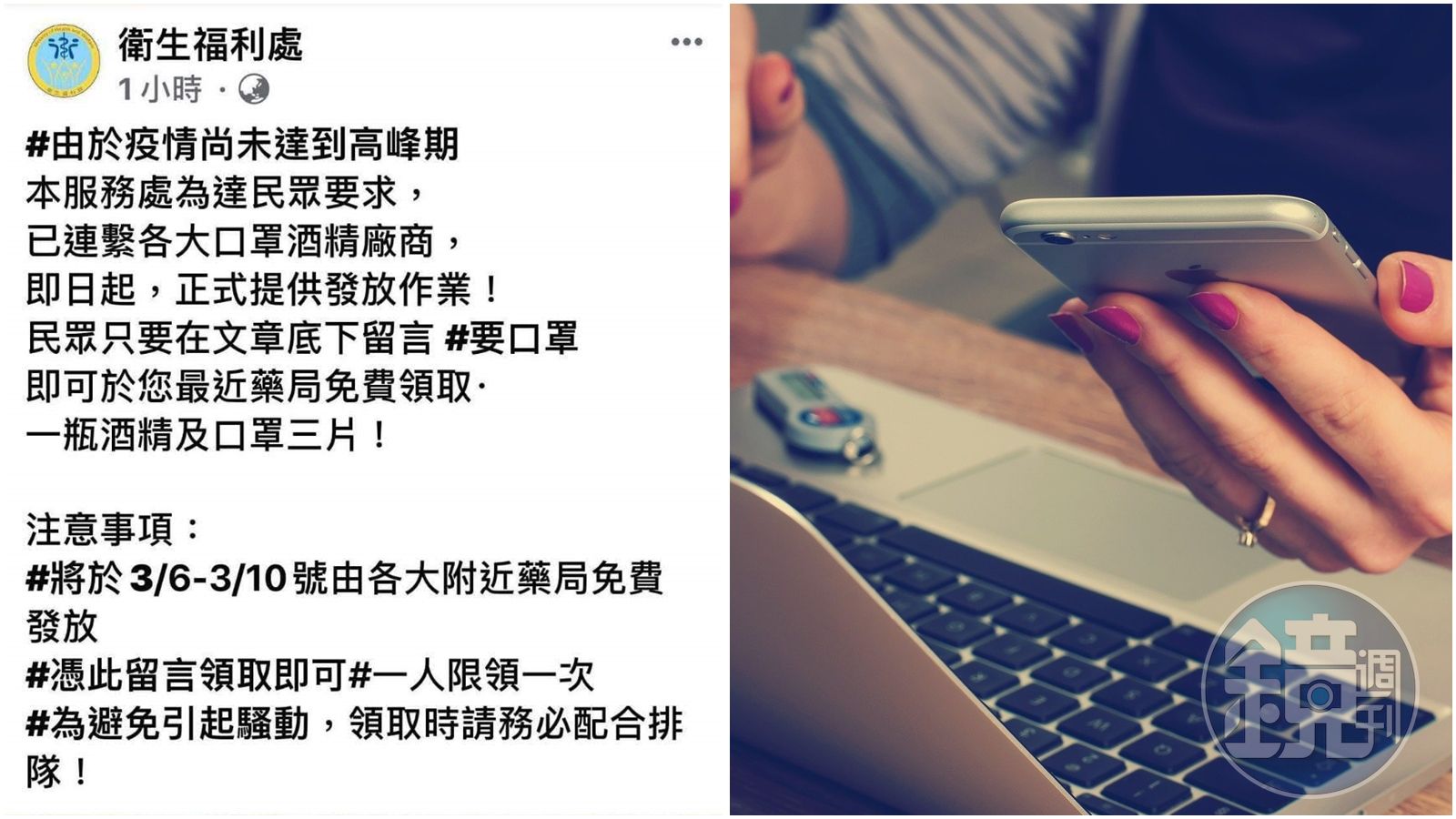 有民眾向警方報案,指臉書粉絲專頁「衛生福利處」,在3月5日張貼文章稱:「本服務處為達民眾要求,已連繫各大口罩酒精廠商,即日起,正式提供發放作業!民眾只要在文章底下留言#要口罩,即可於您最近藥局免費領取。一瓶酒精及口罩三片。注意事項:#將於3/6-3/10由各大附近藥局免費發放#憑此留言領取即可#一人限領一次#為避免引起騷動,領取時務必配合排隊!」等訊息,引發大眾質疑是否為官方所為。