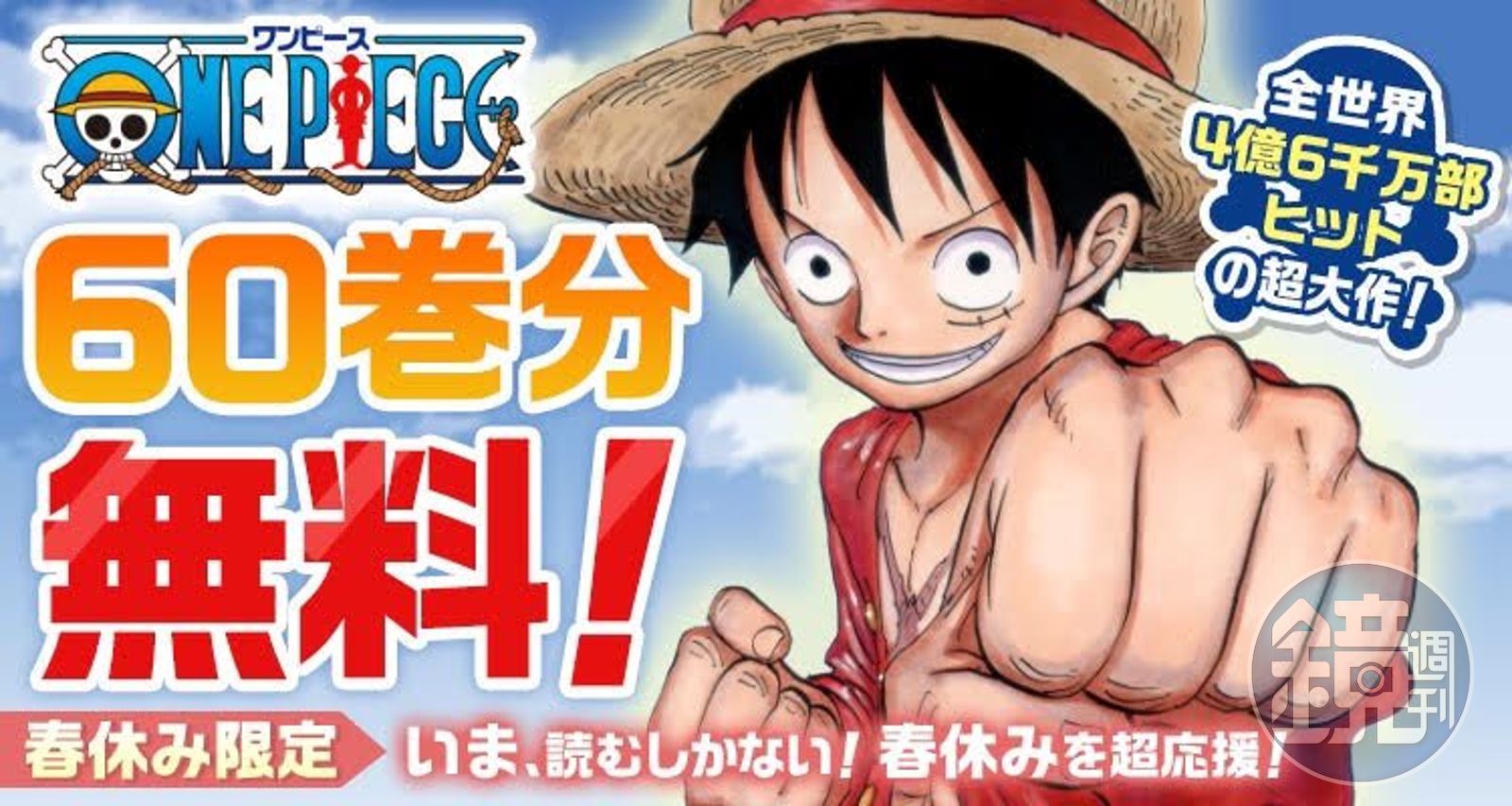 《週刊少年JUMP》的連載人氣漫畫《航海王(ONE PIECE)》9日宣布,為了應援長時間的春假,即日起1到60集開放免費線上閱讀,直到4月5日為止。
