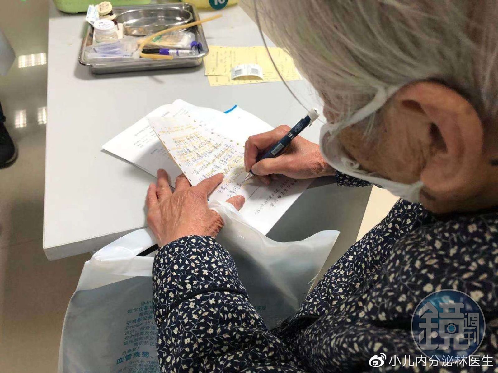 醫師表示,自己在大年初十的凌晨遇到老奶奶,當時她已經照顧兒子4天4夜,等到兒子住進病房,她才找醫師為自己做檢查,她告訴醫師「我這個年齡已經無所畏懼了」,在等待檢驗結果時,老奶奶向護士借了筆,留了一張字條給兒子,上頭寫著:「兒子,要挺住,要堅強,戰勝病魔。要配合醫生治療,呼吸器不舒服,要忍一忍,以便恢復。如果血壓正常,鼻孔吸氧,請求醫生。忘記給現金,託醫生帶上伍佰元,可託人買日常用品。」