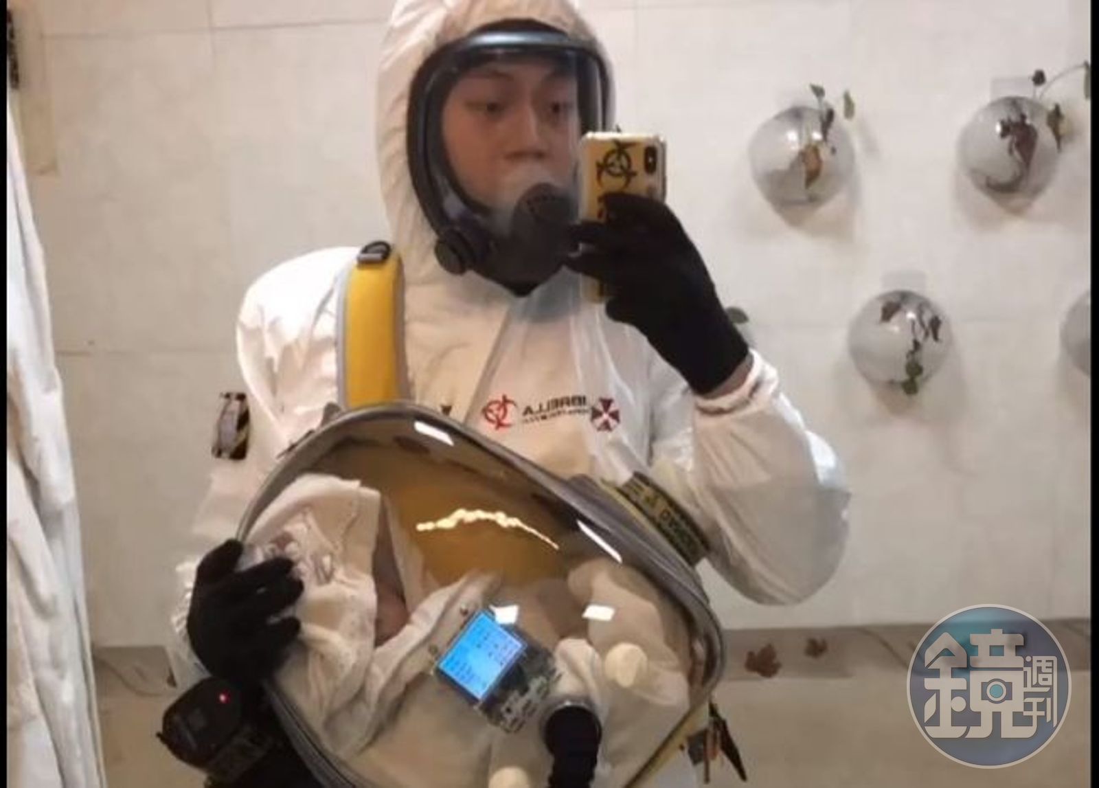 他自己則穿上印有《惡靈古堡》防護傘公司標記的全套防護衣,背包外掛的空氣濾淨器和連手機殼也有小巧思。