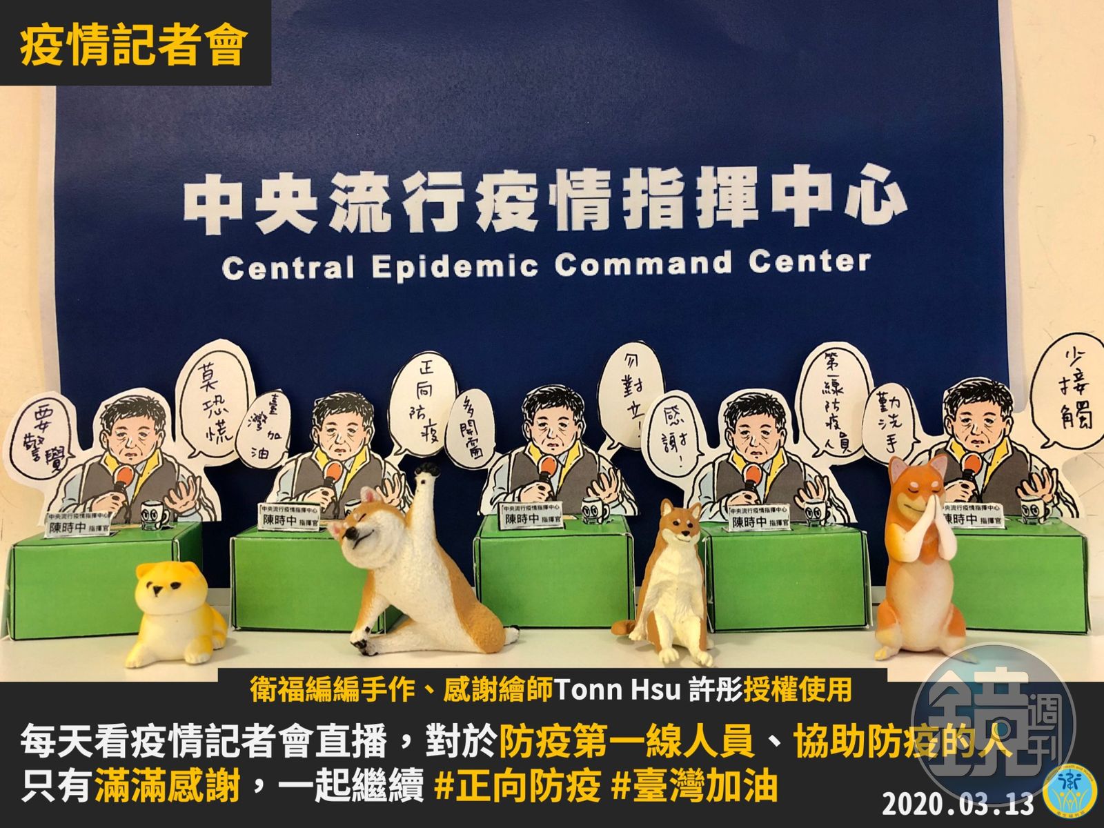 插畫家許彤日前按照陳時中開記者會時的形象,做出Q版阿中的立體立牌,旁邊還附上對話框,能自行配上OS提醒全民防疫。由於太多網友求圖,她特別開放原始圖片讓大家自行列印,最佳列印尺寸為4*6, 期限到3月16日 。