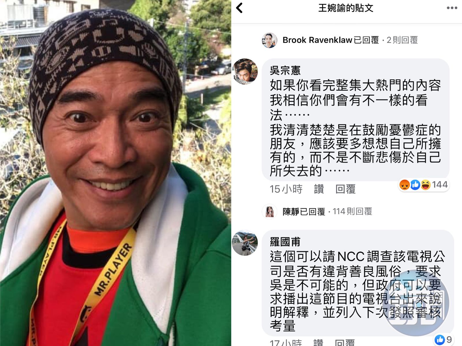 綜藝天王吳宗憲日前在節目上表示「憂鬱症的起因來自不知足」,這番言論事後引來包含立委王婉諭、網紅陳沂等人的批判。隨後吳宗憲特地前往王婉諭臉書留言區留言,要立委看完節目再做定論,而王婉諭也在深夜對吳宗憲的質疑作出回應。