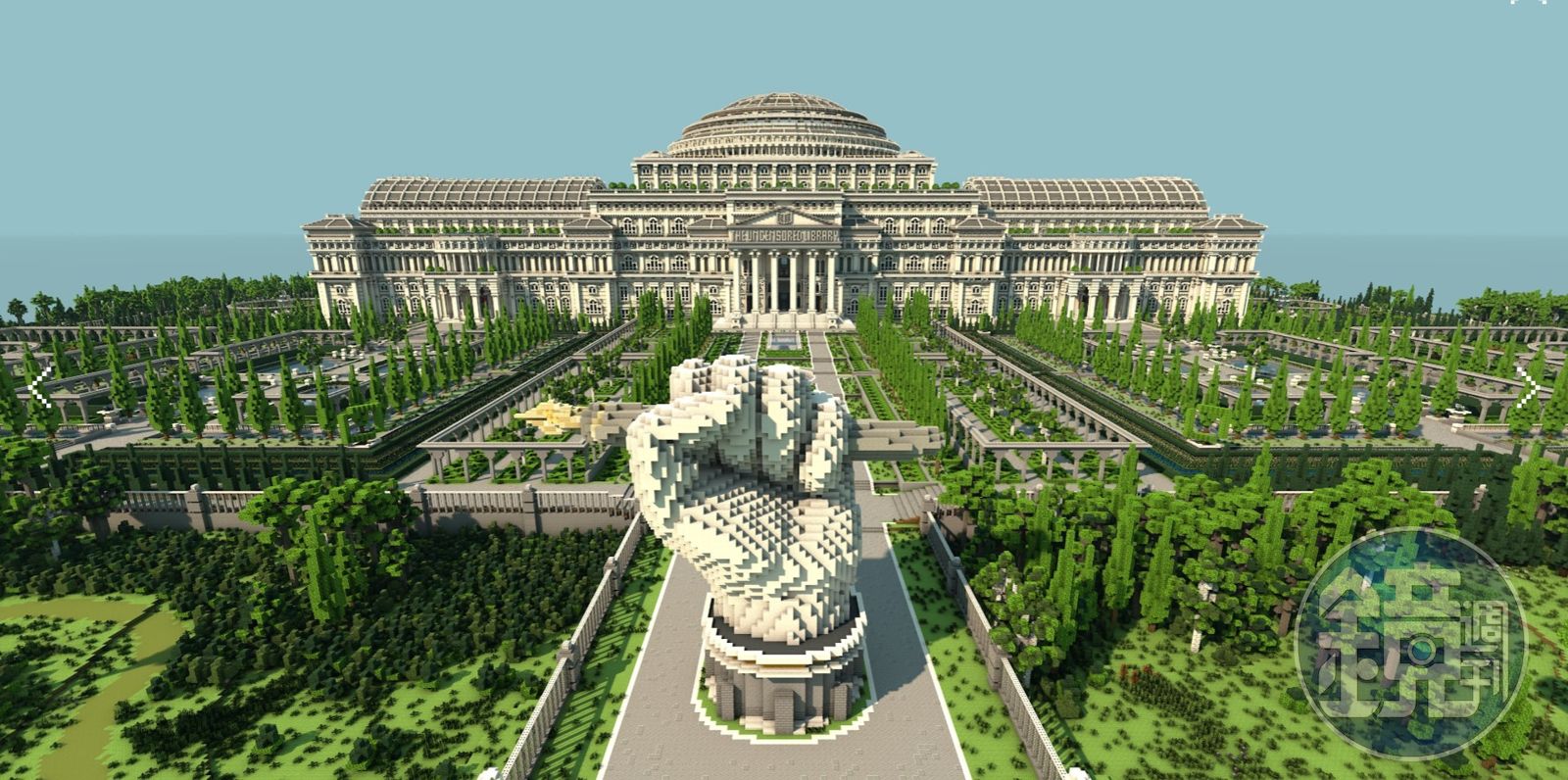 這座採用新古典主義風格打造的虛擬圖書館,位於遊戲中的一個孤島上,總共動用了1250萬塊磚、由分別來自16個國家的24位創世神所打造,光是設計結構就花費了足足250個小時。圖書館內又劃分為六大區域,其中一個區域是介紹無國界記者組織,並且可以查詢世界上180個國家的新聞自由度排名。