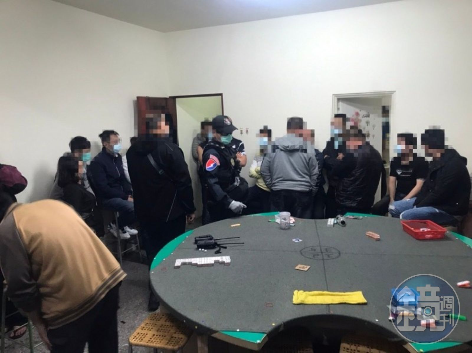 此外,正值防疫期間,攻堅員警全都戴上口罩,也準備額溫槍到場,當衝進賭場後,發現在場賭客半數戴上口罩,但也有不戴的,為了避免感染,在押送到偵防車前,所有嫌犯一律先量額溫,再送到駐區警察機關偵訊,全程雙方都戴口罩,偵防車與警車也全數進行消毒。