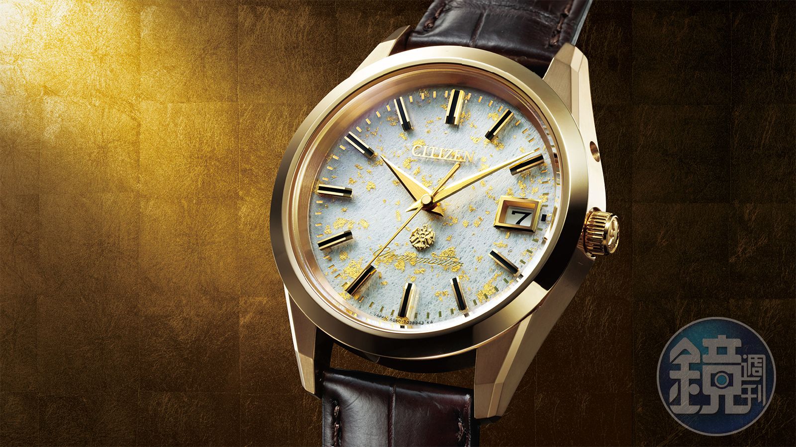 既然是特別版,面盤用的和紙當然也要有點不一樣。土佐和紙結合來自生產金箔已有400年歷史的金澤所產的金箔,以「砂子蒔き」的工序製作這款和紙。工匠先將23K金箔放入前端有篩網的竹筒中,再用以棒型工具壓磨金箔,篩網的粗細會影響金箔成品的大小,要決定金箔呈現細粉或是塊狀,就要先選定好篩網的孔洞粗細。磨好之後再將金箔倒入相同的筒內,然後慢慢散在沾附膠水的和紙上,重複幾次之後才算完工。特別版的金箔和紙搭上黃金色澤的硬化處理超級鈦錶殼,以金色做為主調是滿常見的紀念版模式,如果真的用了黃金做錶殼好像就不那麼CITIZEN了。