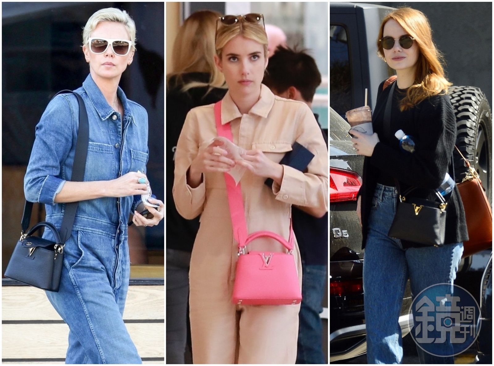 莎莉賽隆(左)、艾瑪羅勃茲(中)、艾瑪史東(右)趴趴走時的良伴皆為LV Capucines Mini手袋。(Louis Vuitton提供)發布時間:2020.03.17 10:15 臺北時間