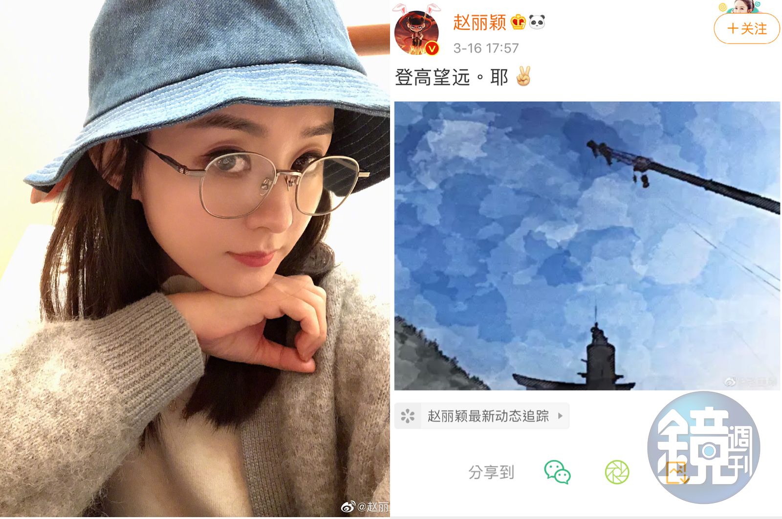 趙麗穎貼上一張吊車高居照片,寫上「登高望遠,耶!」背景深藍的天空,似乎在宣告著大陸疫情撥雲見日,迎來藍天。趙麗穎工作室隨後也轉發貼文,並標註「BOSS在這」,據悉是趙麗穎正在拍攝吊鋼絲戲時的現場實況,也看得出她對於能復工拍戲相當開心,粉絲們無不期盼早日能見到其新作。