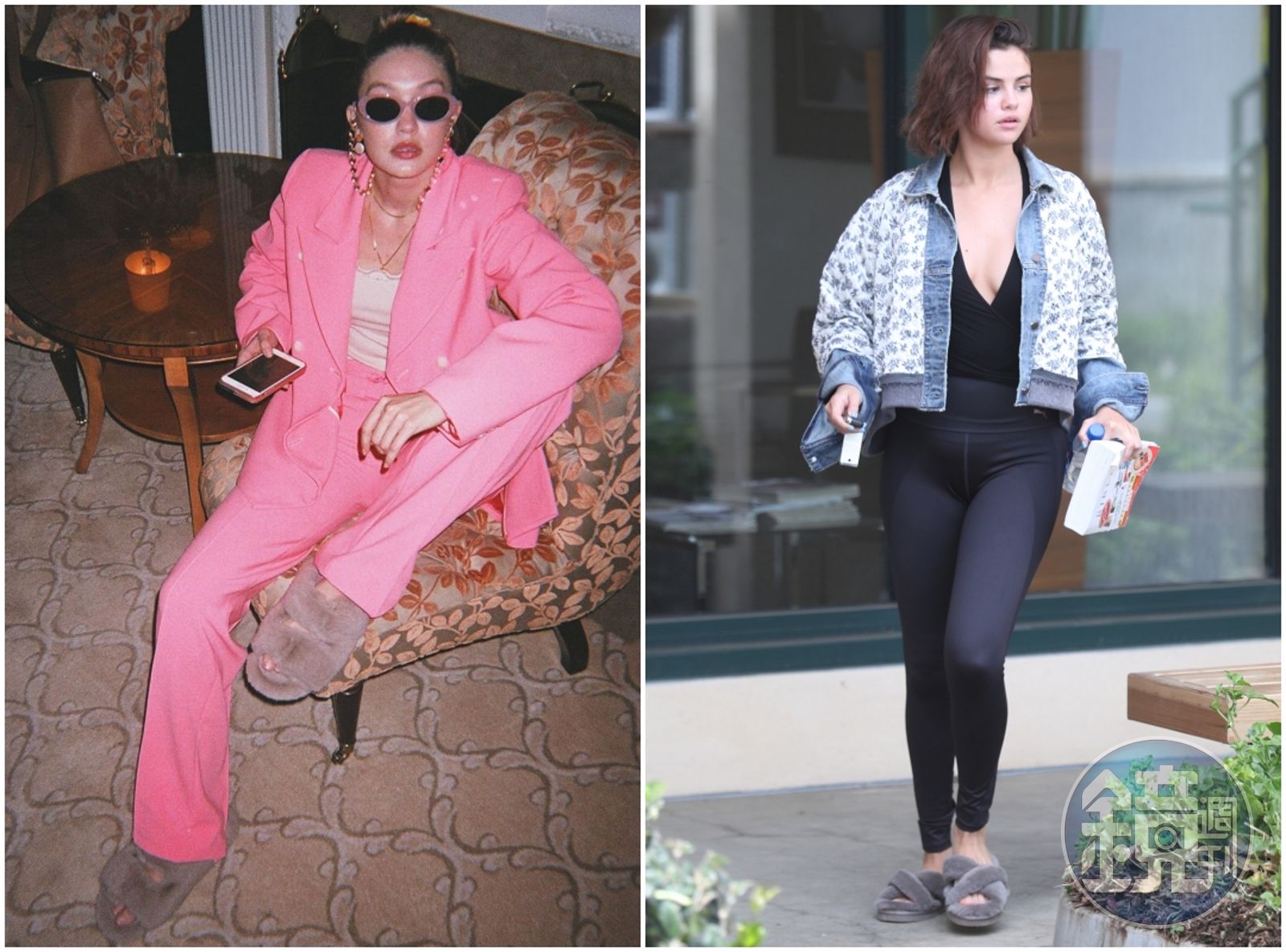 Gigi Hadid以一種大姐大的氣勢,穿著套裝搭配UGG FUZZ YEAH涼鞋。(藍鐘提供)超模Gigi Hadid總是鎂光燈的焦點,她穿著桃粉色套裝,氣勢十足的單腳跨在椅子上,像個大姐大一般的模樣,腳上正是UGG的FUZZ YEAH涼鞋;恐怕是剛健身完的席琳娜戈梅茲,不在乎一身肉圓圓的身材被緊身服裝束縛著,走在路上展現隨性自我的她,腳上踩著的即是FUZZETTE毛拖鞋。