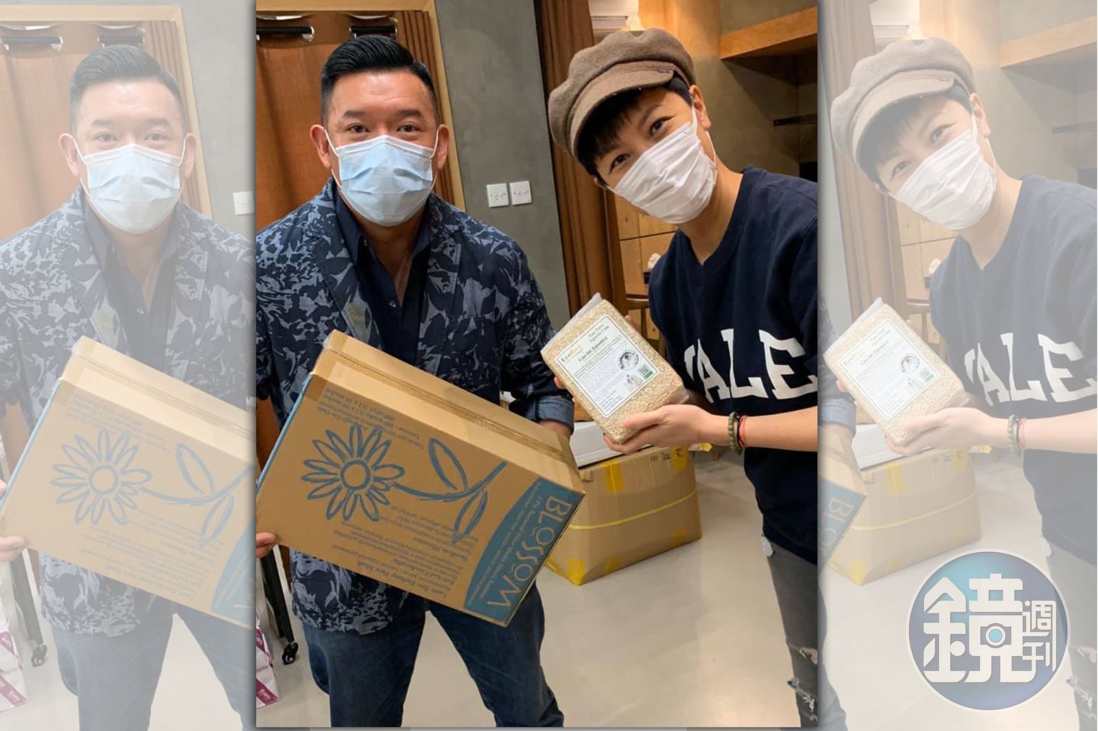 何韻詩在社交網站放上與杜汶澤合照,以米一包換口罩非常開心。(翻攝何韻詩臉書)杜汶澤早前貼出照片,他和何韻詩一人拿口罩一人拿米,寫道:「家裡的米缸空了,只好拿一箱口罩去換一包米.....不知我是不是被人坑了?這包米也太小包!」