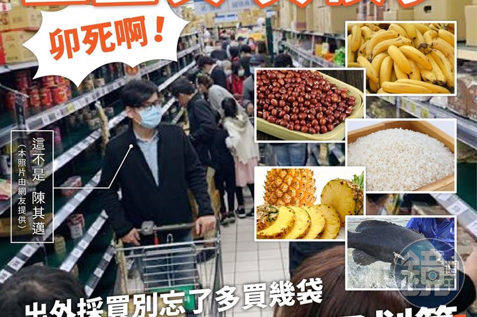 「武漢肺炎」(亦稱新冠肺炎,COVID-19)疫情全球延燒,我國日前出現民眾囤貨潮,行政院副院長陳其邁昨(20日)晚在臉書PO文,貼出民眾寄給他的照片,只見一個外型神似陳其邁的民眾也在搶購囤貨,他除了澄清不是自己,也喊話「貨很多,買不完」,也推薦民眾如果要採買,別忘了多買幾袋當季物產最划算。