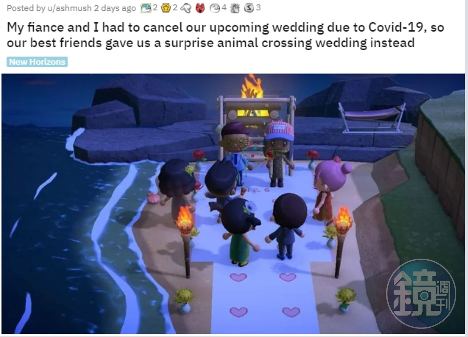 受到疫情影響,Switch遊戲《集合啦!動物森友會》玩家在線上舉辦小而美的婚禮。(翻攝自reddit)發布時間:2020.03.25 16:33 臺北時間