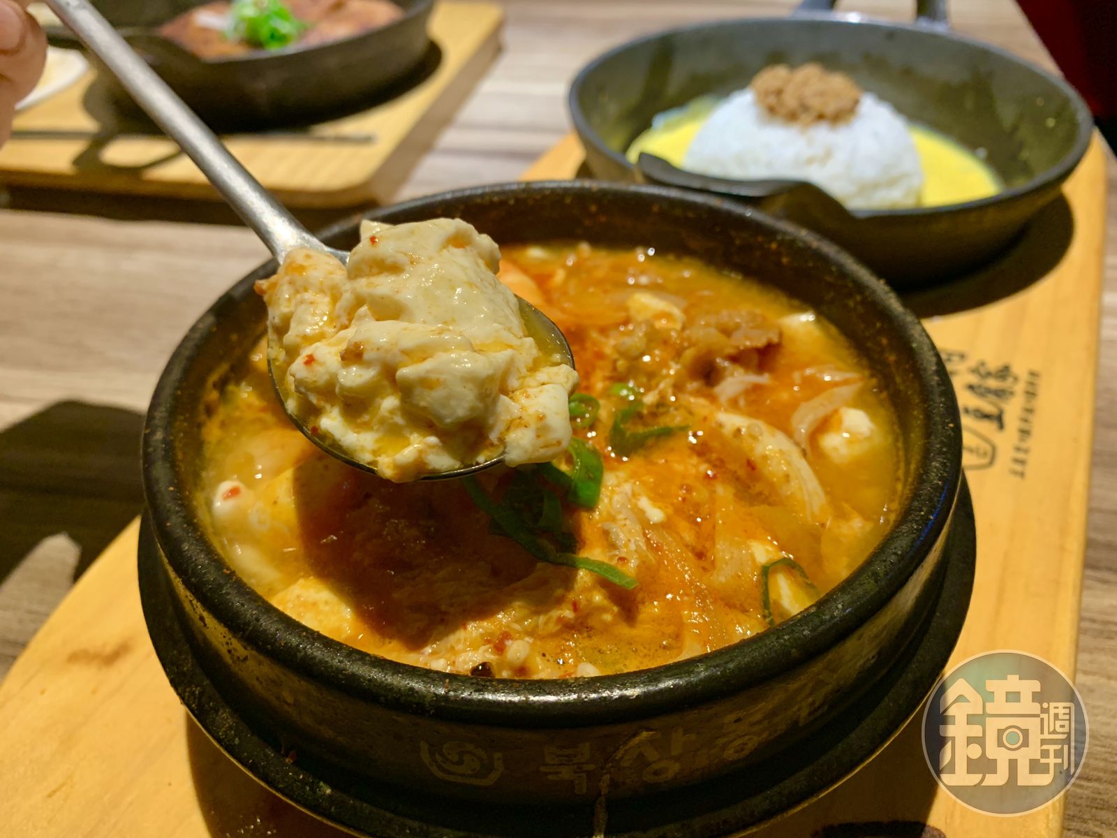 點嫩豆腐煲都會另外附上用鑄鐵盤裝著的拌飯,盤底會有蛋汁、飯上還會澆淋肉臊,但我覺得最美味的吃法,還是模仿張會長,一口辣湯、嫩豆腐配一口單純的白飯。