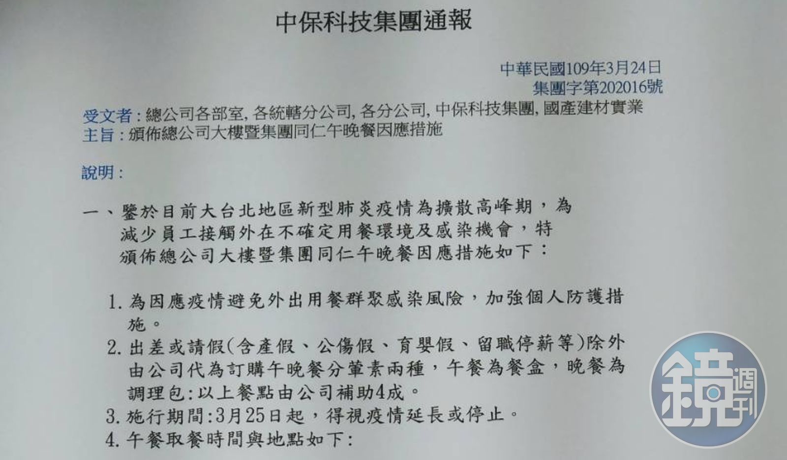 1位中保員工向本刊爆料,中保總公司近日發出內部通報,內容指出,因大台北地區疫情持續擴散,為了減少員工接觸外在不確定用餐環境及感染機會,自25日起實施午晚餐措施,由公司代為訂購午晚餐,並補助4成餐費。