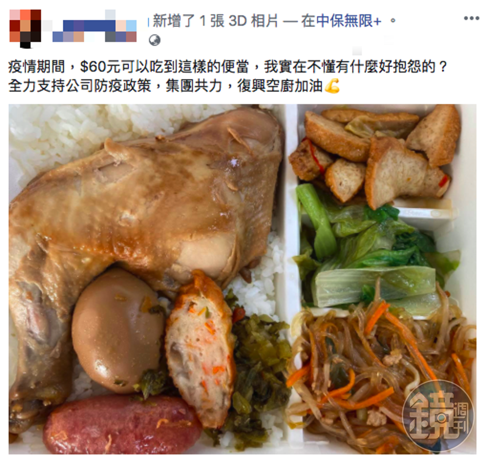 不過,中保副總經理張迺森25日則在臉書上PO出60元的便當菜色,內有雞腿、滷蛋、香腸及3樣小菜,他並寫道:「疫情期間,$60元可以吃到這樣的便當,我實在不懂有什麼好抱怨的?全力支持公司防疫政策,集團共力,復興空廚加油」。