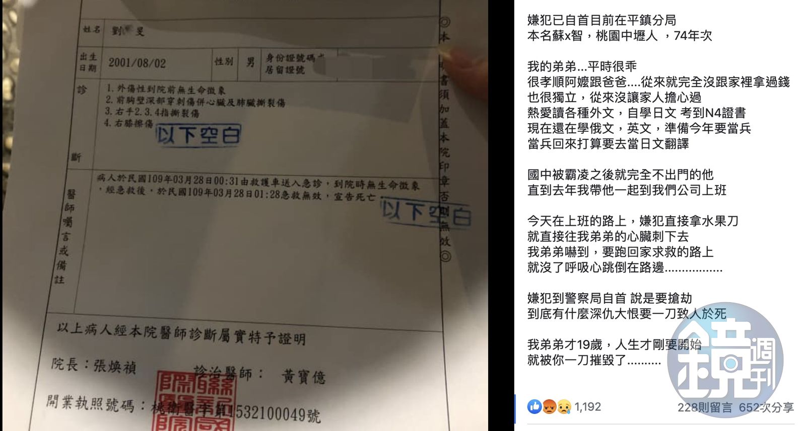桃園19歲劉姓男子在路上遭刺身亡,其姊姊在臉書貼文表示希望大家可以分享該起事件。(翻攝《我是中壢人》臉書社團)發布時間:2020.03.28 11:34 臺北時間