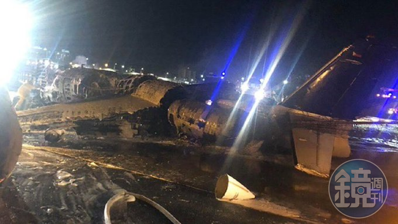 從民眾拍攝的畫面看到,飛機斷成三截,在機場跑道燃起熊熊大火與黑煙,消防局獲報後,也立即出動救援,用了1個小時才把火撲滅。