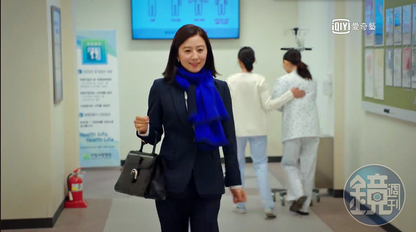 在金喜愛飾演的家醫科醫生看診時,Brillant包款就放在辦公桌旁。(愛奇藝台灣站提供)金喜愛在劇中飾演家醫科醫生。因此服裝以簡潔、幹練為主要形象,無論是她穿著深藍色西服褲裝,或是問診時的白色襯衫外罩醫生袍,與DELVAUX Brillant包款結構俐落的輪廓都配合得完美無瑕。