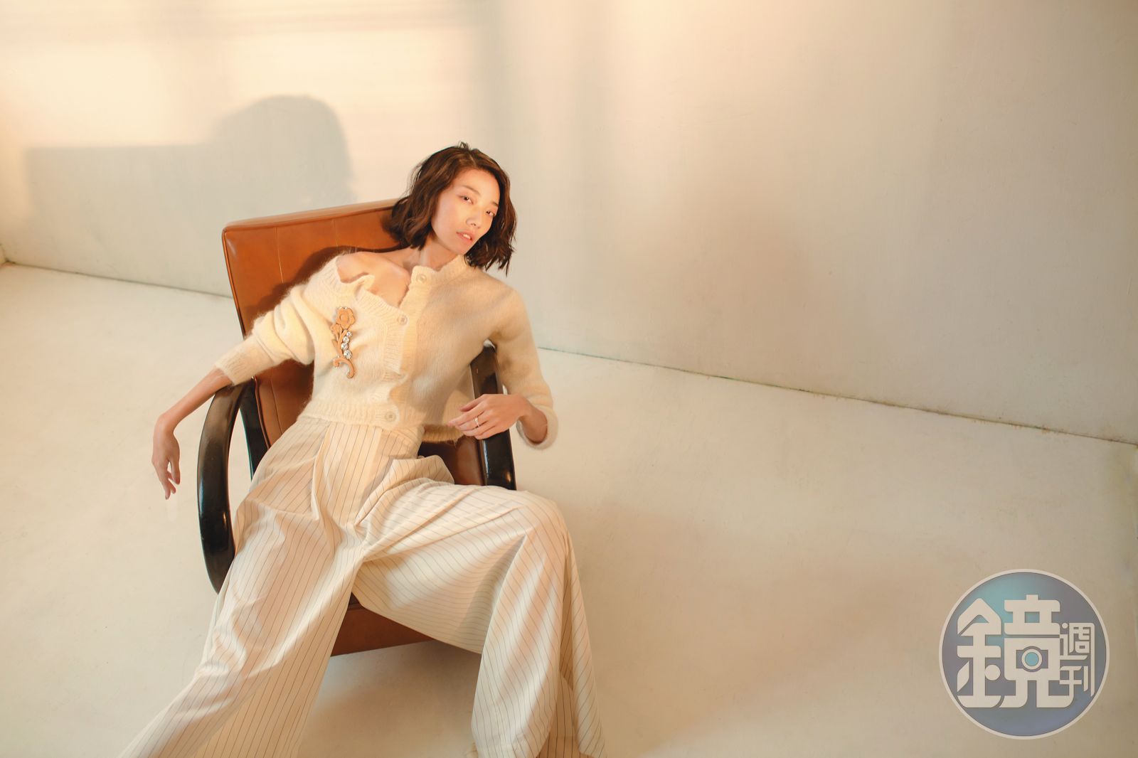 絨面馬海羊毛開襟毛衣 NT$32,000 by MIU MIU、米白色條紋寬褲 NT$56,000 by BRUNELLO CUCINELLI、花朵造型木質珠寶胸針 NT$11,500 by MIU MIU、Lifelong Heart戒指 NT$4,990 by SWAROVSKI。發布時間:2020.04.10 06:00 臺北時間