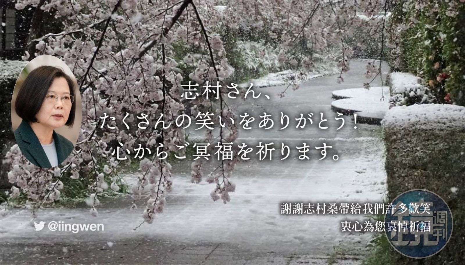 蔡英文總統於下午1:18分發表悼文,「志村けんさん、国境を超えて台湾人にたくさんの笑いと元気を届けくれてありがとうございました。きっと天国でもたくさんの人を笑わせてくれることでしょう。 ご冥福を心から祈ります。」之後再於總統臉書專頁發表中日雙語悼文,「志村健桑,感謝你超越國境、帶給台灣人許多歡笑與元氣,相信你即使在天國,也一定會帶給很多人歡笑的吧。在此衷心為您哀悼祈福。」讓台灣與日本粉絲紛紛留言,一起懷念志村健。