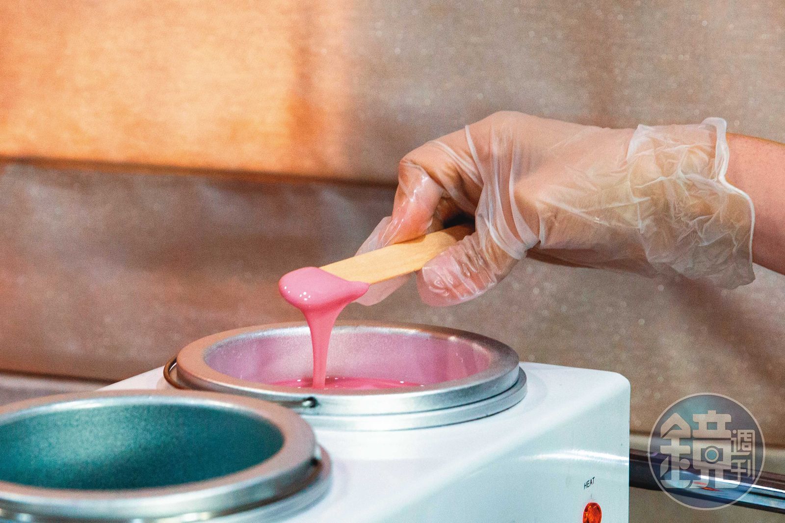 米奇說,不論男、女,私處以「蜜蠟除毛」效果最好。她並向本刊示範,先將裝著蜜蠟的加熱器打開,接著替客人基礎清潔、稍微修剪,之後才開始上蜜蠟,等乾掉後,整片拔除,最後再以小鑷子將細毛拔除,整個過程大約一小時。