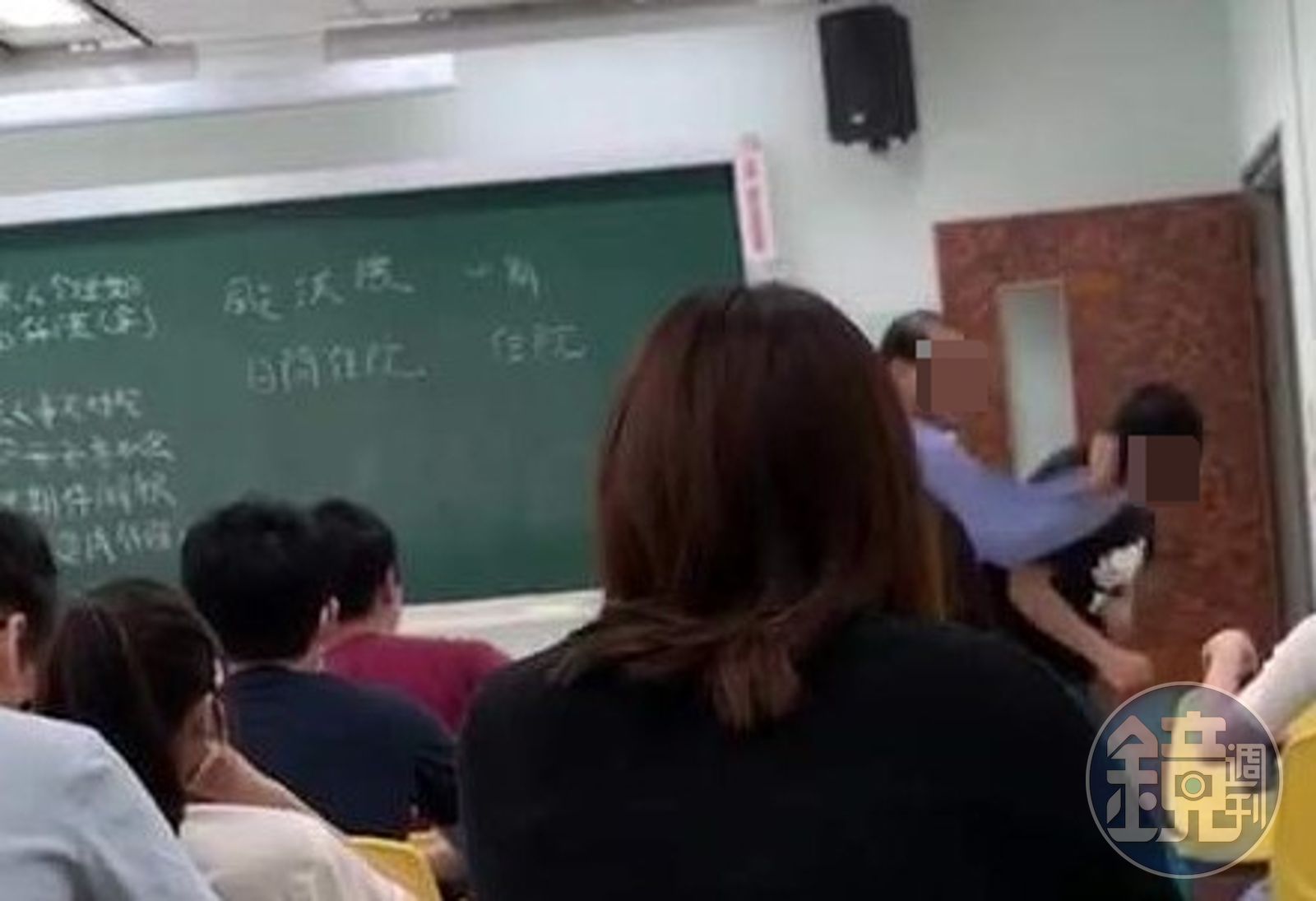 根據本刊取得的照片內容,只見該教授不斷揮舞左拳、右拳,攻擊男同學的頭部兩側,推斷當時男同學硬生生挨了不少記重拳。身材高大的教授,還把人逼到門邊,打得男同學毫無招架之力,神情狼狽不堪。在座的同學眼看情勢失控,連忙用手機拍攝存證。