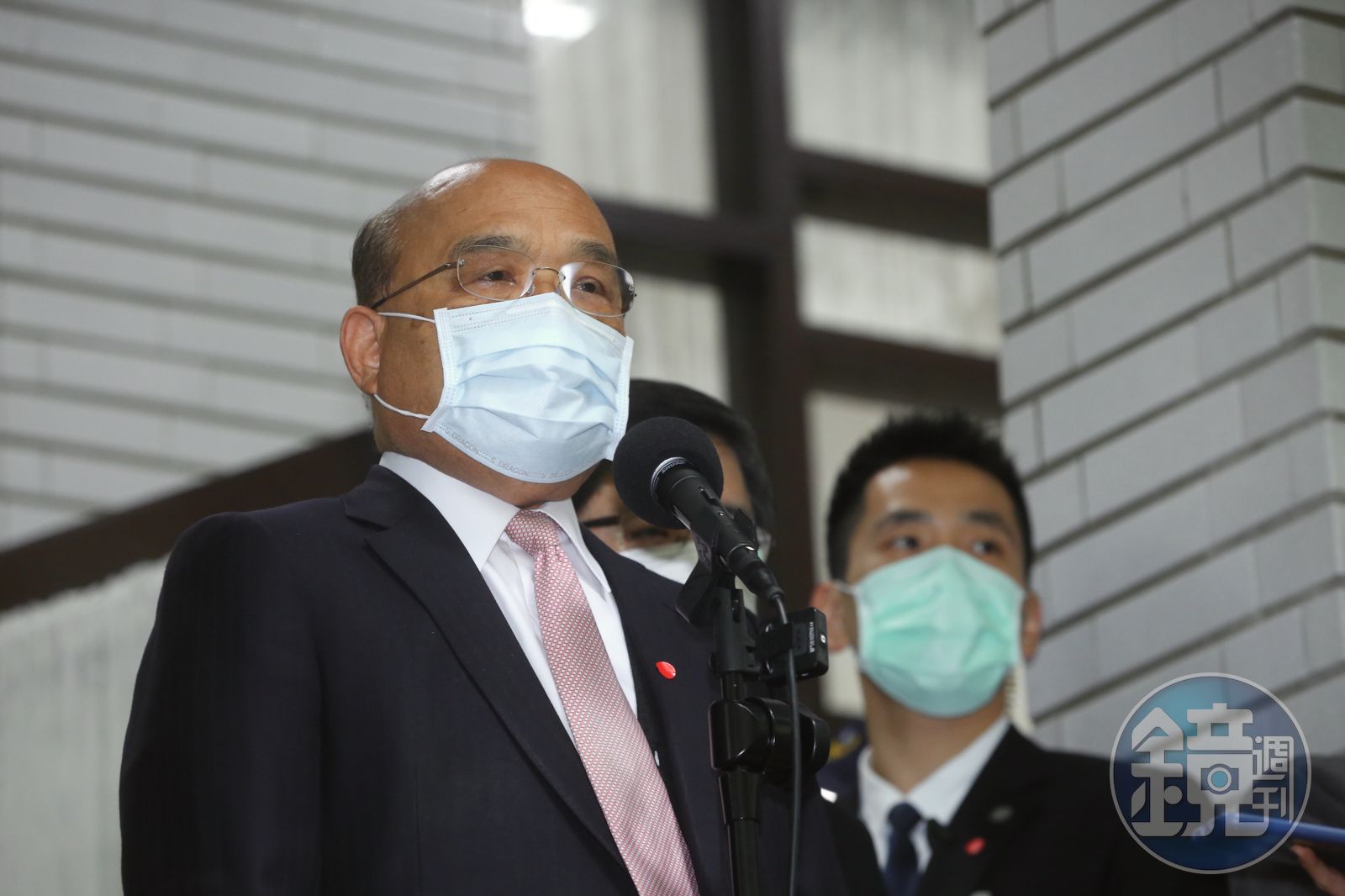 蘇貞昌說,口罩隨產能變化,政府節制使用,讓民眾方便,給第一線醫療人員、公務需要者,甚至頻繁出入醫院得重症患者也都能拿到口罩,政府對每片口罩都很認真使用,「絕對沒有暗槓」。