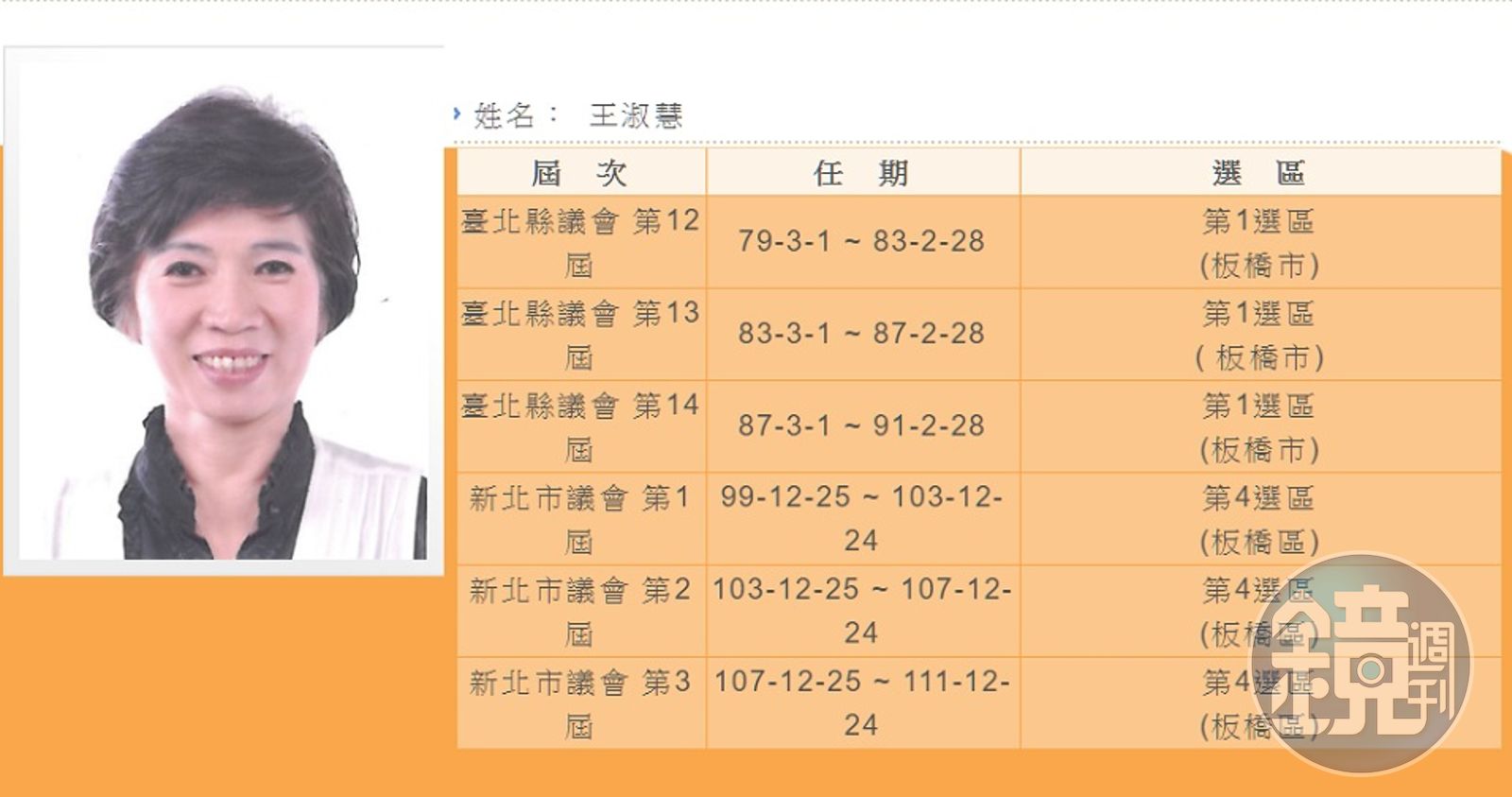 現任民進黨新北市議員王淑慧是從板橋市民代表投身政界,曾連續當選台北縣12屆至14屆縣議員,在2001年轉戰立法院,連任2屆立法委員,在尋求3連霸時失利,隨後台北縣升格為新北市,她再回鍋當選第1屆市議員至今已第3屆。