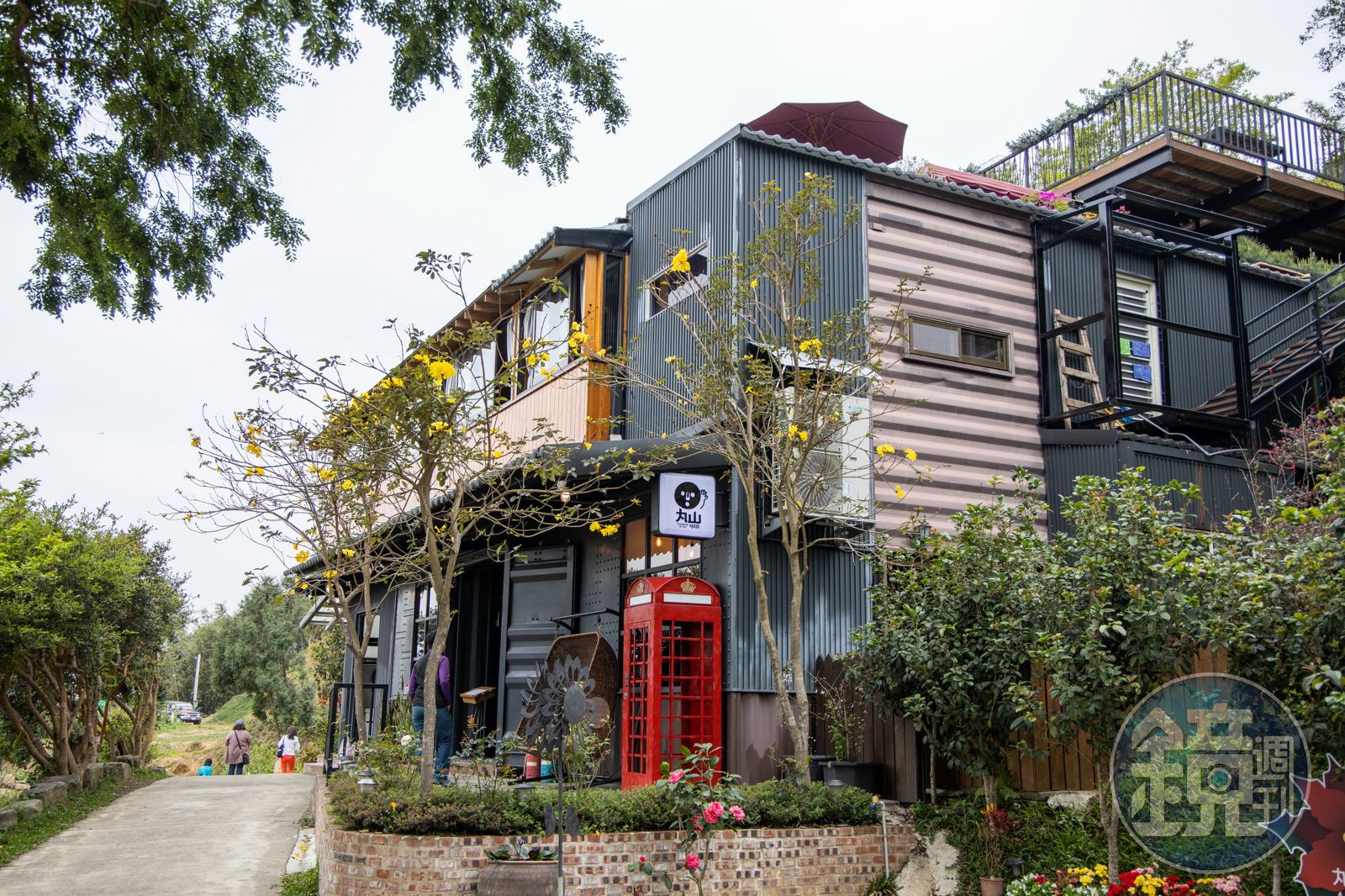 咖啡館裡的成立緣於兒子的夢想,老闆娘廖淑芳笑說:「小孩子想做,我們就一起做。」於是一家人將自己生活的地方,打造成夢幻的咖啡園區。由貨櫃屋拚接而成的咖啡屋,以黑色為主題,有著時尚的洗鍊感,其中也不乏可愛物品的點綴,一樓是工業風的吧台、二樓為室內用餐區,三樓則是開放式景觀區、四樓單純賞景,運氣好還可看到金黃色的夕陽映照在石門水庫之上的美景。