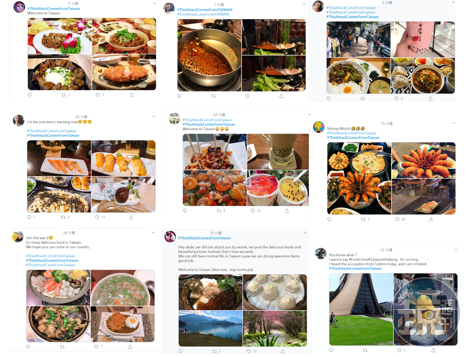 Twitter 上出現大量附有「#ThisAttackComesFromTaiwan」標籤的推文,內容全是滷肉飯、珍珠奶茶、雞排、肉羹、蔥油餅、羊肉爐、小籠包、芋圓冰、芒果剉冰等美食照,偶爾夾雜風景名勝,讓人大喊罪惡!隨後這個標籤隨著各式台式美食進攻 Facebook 和全世界。