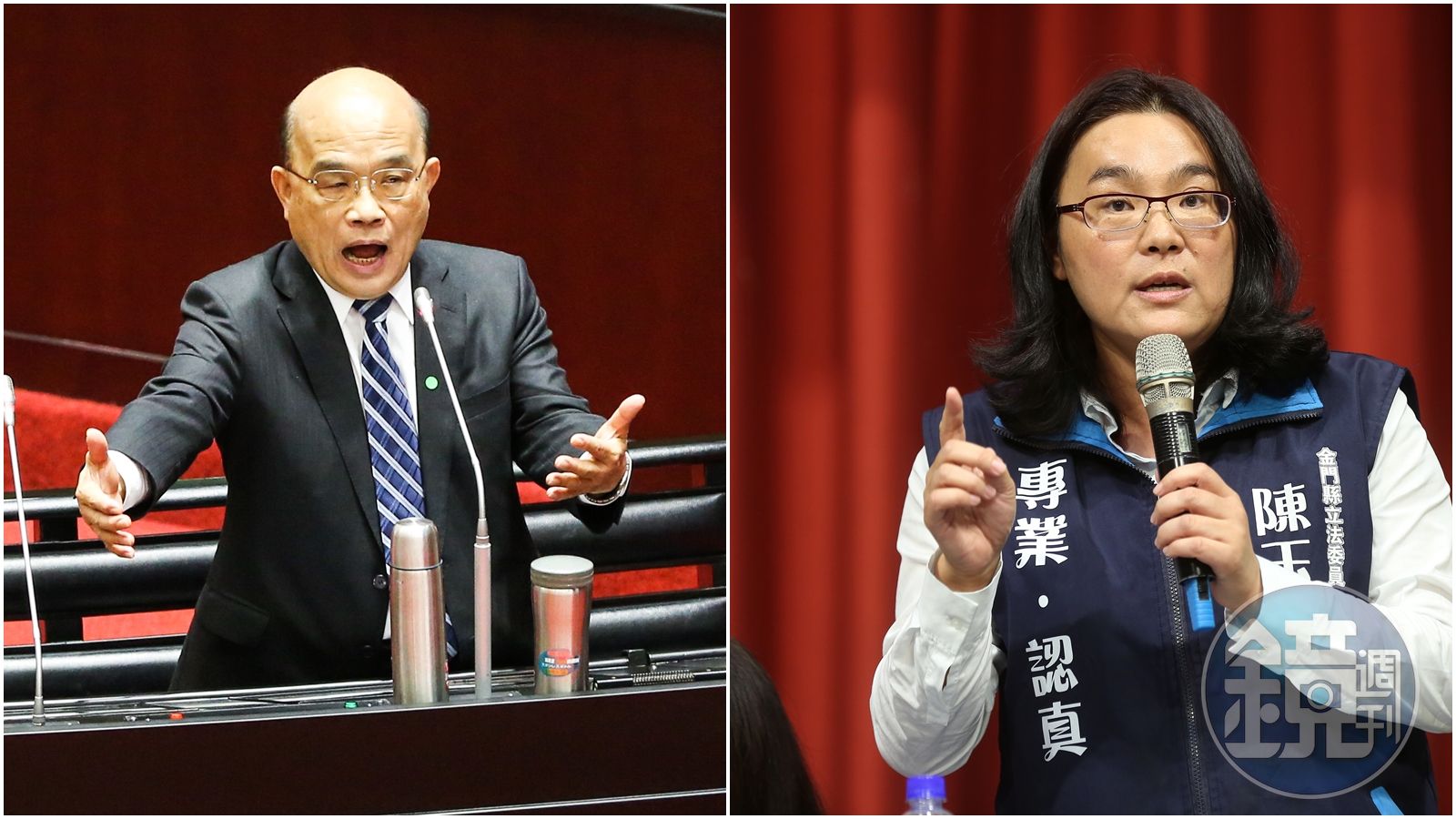 蘇貞昌話鋒一轉,狠批陳玉珍「沒想到妳從金門選出的國會議員,卻講偏向中國的話,妳的講法是主流民意不能接受的。」指陳玉珍領台灣人民血汗錢卻那樣說,直言「如果沒有台灣,還講什麼中華民國? 」陳玉珍反過來質疑蘇,「如果只有台灣也沒有中華民國啊!」並指出中華民國是包含台、澎、金、馬四個地方,這就是憲法體制的問題。