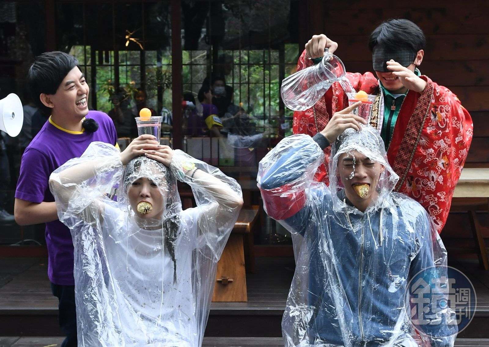 最後一棒的宋柏緯在背完台詞後則要挑戰矇眼倒水,由於隊友們嘴巴都含饅頭,無法清晰下指令,只能靠宋柏緯自己判斷水杯方向,敵隊黃子佼則不斷在旁邊給錯誤的提示,結果導致所有演員都慘招他無情水洗,連劇中飾演暖男的王可元都忍不住大聲嚷嚷:「宋柏緯,你會不會玩遊戲啊!」