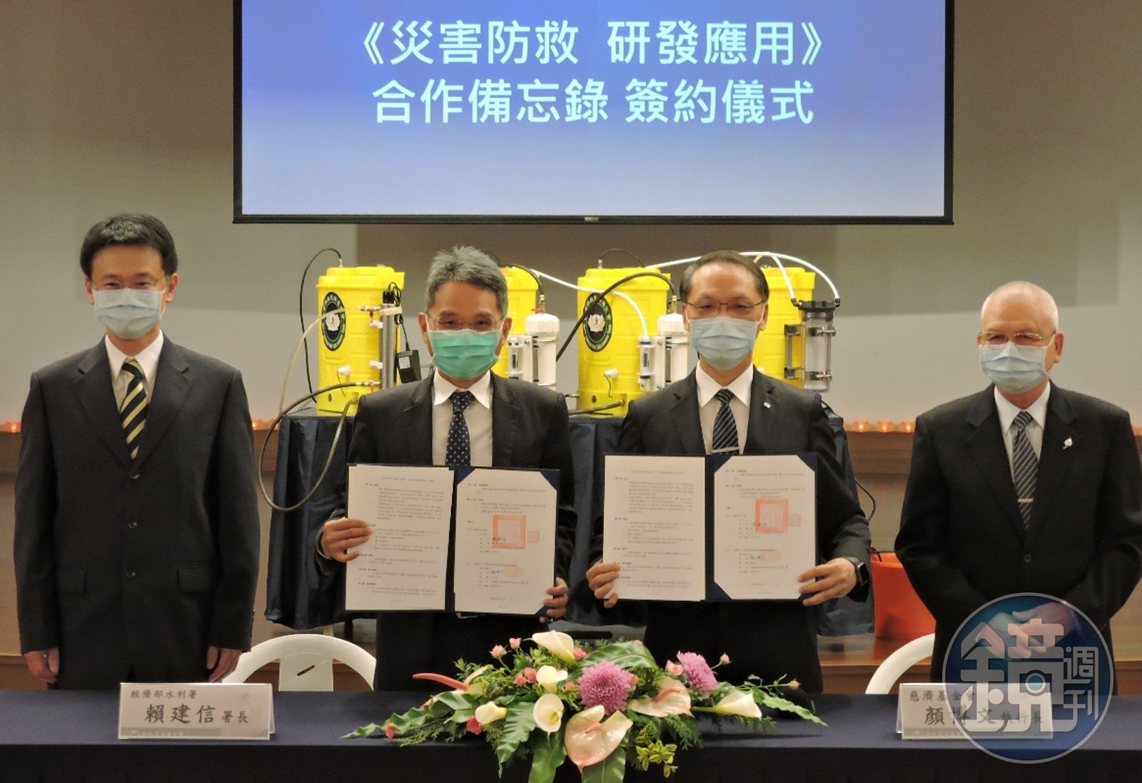 水利署指出,為了協助災區受災民眾安全用水需求,目前已經研發15CMD(每日生產15噸飲水)、5CMD、2CMD等3種淨水設備,希望透過協議深化合作關係,擴增政府與民間合作防救災量能。