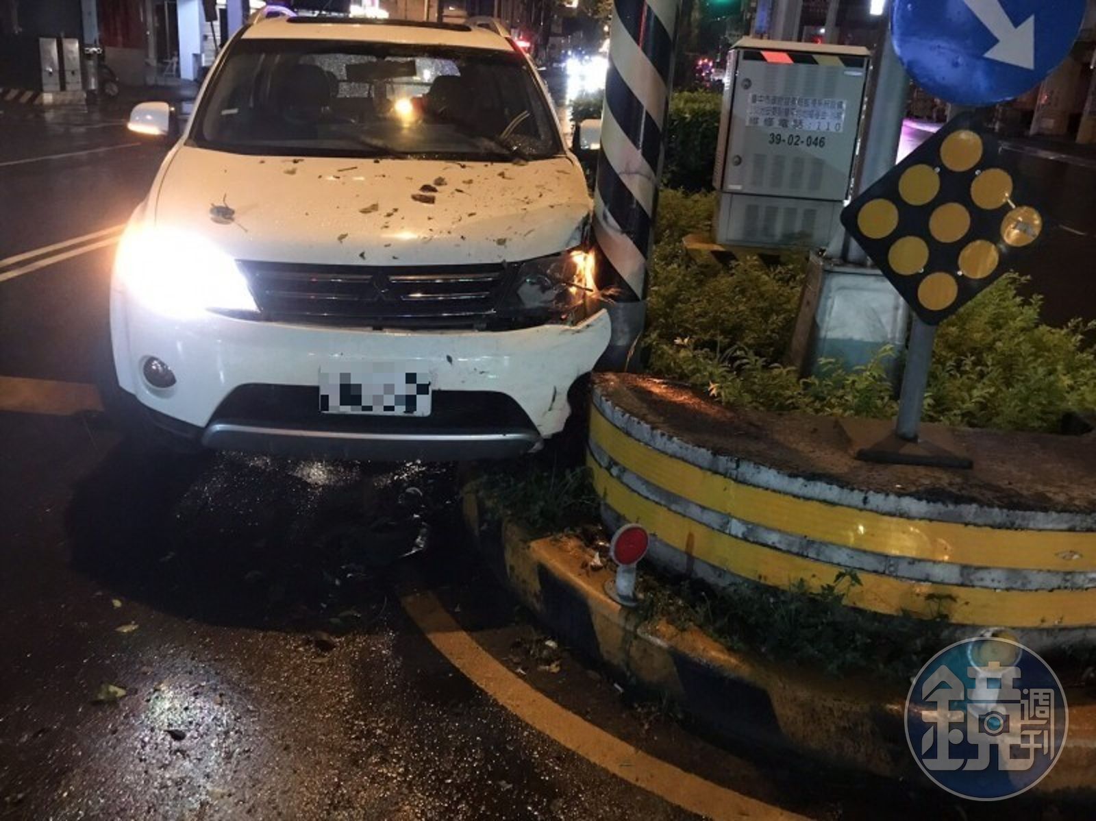 今天凌晨2點多,台中市下著滂沱大雨,而喝得爛醉的47歲陳姓男子還是開著他的白色休旅車上路,但他實在太醉了,車子沿進化北路左轉崇德路,往文心路方向行駛時,撞上路口的中央分隔島,因為撞擊力道太大,陳男白色休旅車左前輪當場脫落,掉在路面上。