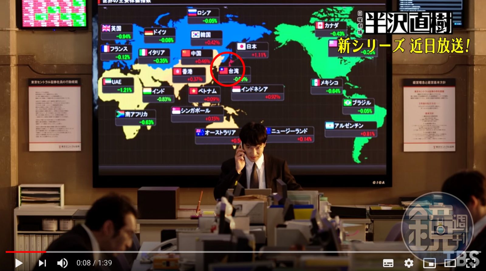 而在近期釋出的預告片當中,飾演半澤直樹的堺雅人坐在辦公桌前,正在講電話,但在他身後的全球股市分佈圖卻出現一大亮點,網友發現在眾多國旗中,「中華民國國旗」也在其中,和五星旗(上海股市)並列。