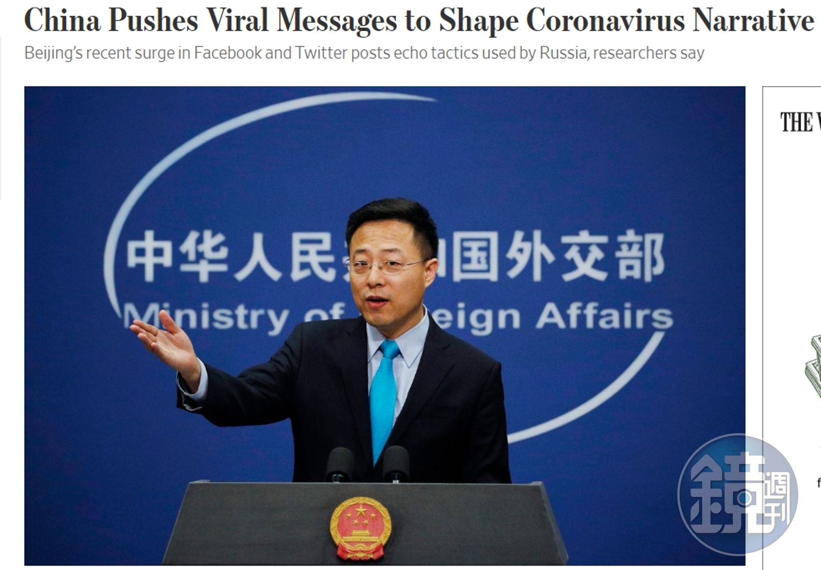 美媒《華爾街日報》(The Wall Street Journal)援用研究指出,中國採取類似俄羅斯政府的假消息宣傳手法,在美國的社群媒體上大肆購買廣告,網址連結到中國官媒的英語平台,宣傳中國對抗武漢肺炎的正面形象。