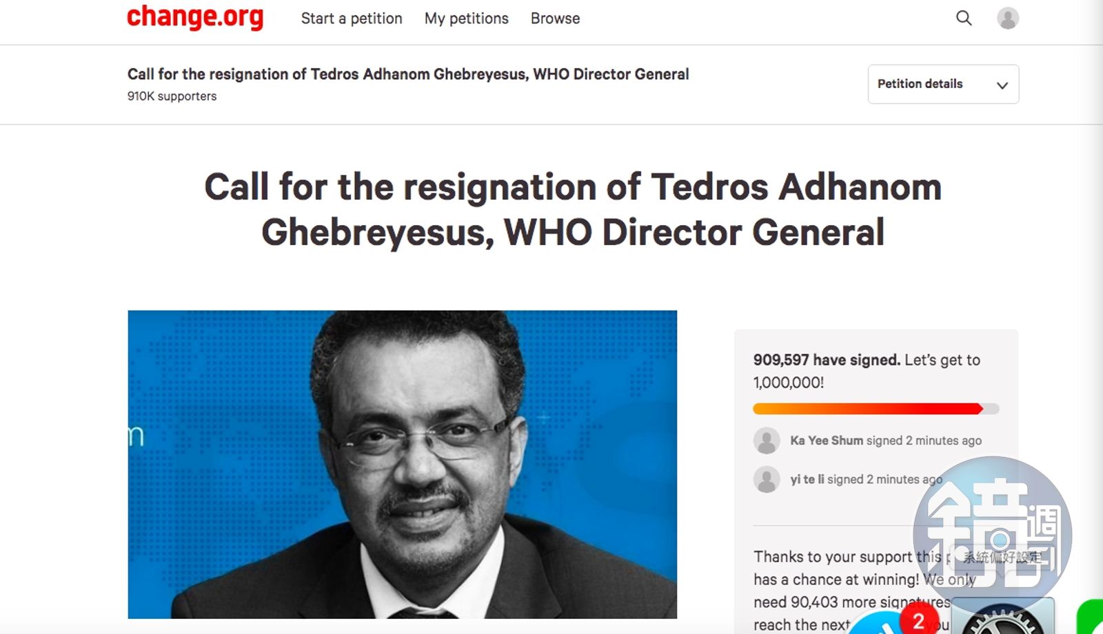 「武漢肺炎」(亦稱新冠肺炎,COVID-19)疫情全球淪陷,確診病例已超過1,797,314人,死亡人數113,135人,日前有加拿大網友在美國知名平台change.org發起連署,要求WHO世界衛生組織祕書長譚德賽(Tedros Adhanom)辭職負責。