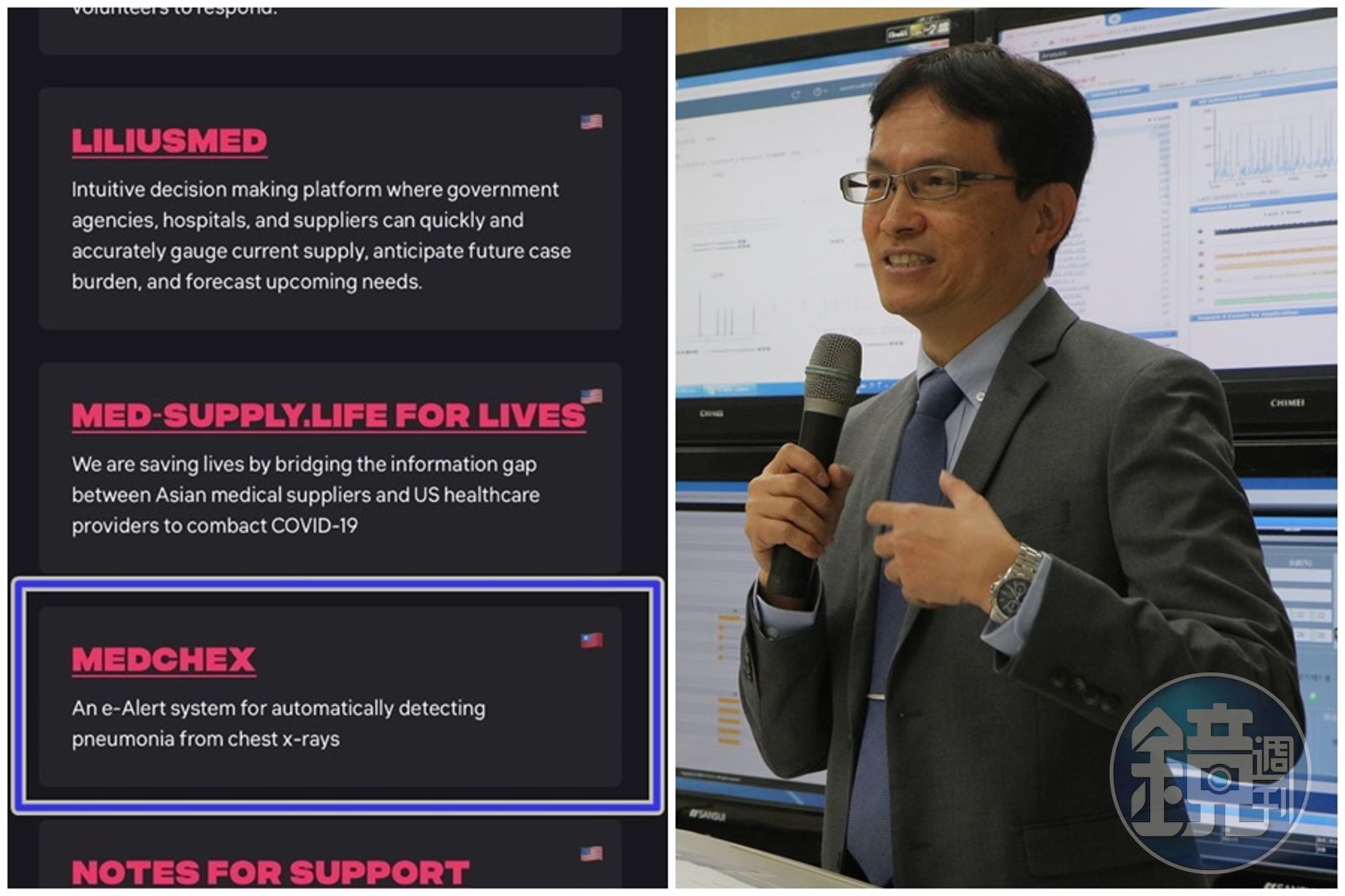 「MedCheX」在醫療科技類獲得評審青睞,是台灣唯一獲選的隊伍,主辦單位在網頁公布獲選隊伍資料,中華民國國旗也登上活動網頁。 「MedCheX」成為台灣唯一獲選隊伍,登上WHO活動網頁。(成大官網)「國際COVID19科技防疫黑客松大賽」由世界衛生組織(WHO)與臉書(Facebook)、微軟(Microsoft)、微信(WeChat)等8大科技大廠合作舉辦,針對7大主題,包含醫療科技、弱勢族群(年長者、患免疫問題者)、經濟、社群、教育、娛樂以及其他面向,邀請科技人集思廣益,共同作戰對抗疫情。