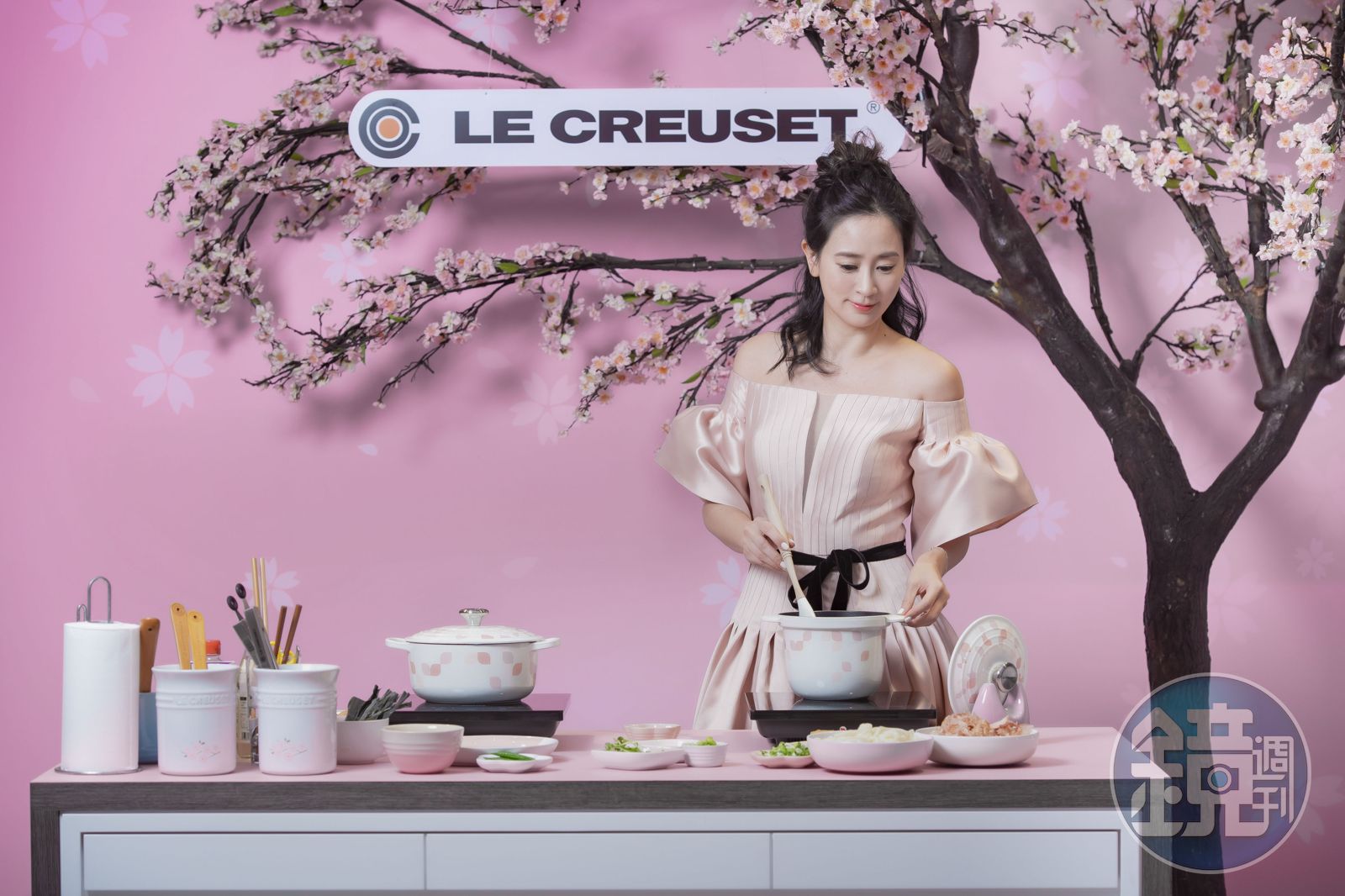 李晶晶在美國的家中,還有為鑄鐵鍋特別訂製的同色系花瓣裝飾。(李晶晶提供)記者會現場,李晶晶與主廚吳治君聯手下廚,用即將上市的櫻之雪鑄鐵鍋端出春日櫻花料理,這個5月1日將要推出的限量商品,有18公分的窈窕鑄鐵鍋、20公分圓鐵鍋,李晶晶嬌嗔:「我一到現場就好喜歡說我要買,結果根本還沒開始賣!」