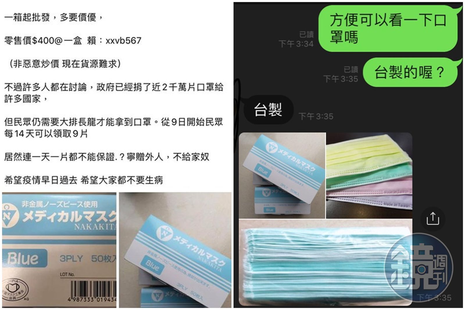 本刊近日接獲讀者爆料,有人在網路兜售醫療用口罩,內文中業者表示口罩上有鋼印,百分之分MIT,還強調「零售批發代理都可以」,疑囤積大量口罩,要發國難財。